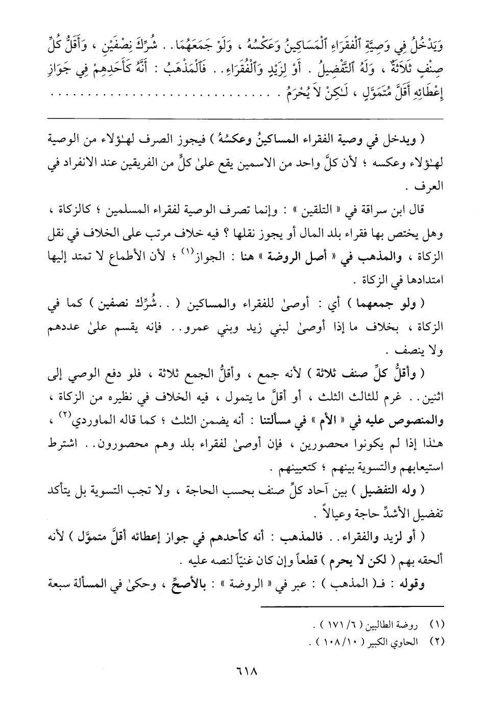 (وأقلُّ كلِّ صنف ثلاثة) لأنه جمع، وأقلُّ الجمع ثلاثة، فلو دفع الوصي إلى اثنين .. غرم للثالث الثلث، أو أقلَّ ما يتمول، فيه الخلاف في نظيره من الزكاة، والمنصوص عليه في "الأم" في مسألتنا: أنه يضمن الثلث؛ كما قاله الماوردي (٢)، هذا إذا لم يكونوا محصورين، فإن أوصى لفقراء بلد وهم محصورون .. اشترط استيعابهم والتسوية بينهم؛ كتعيينهم.