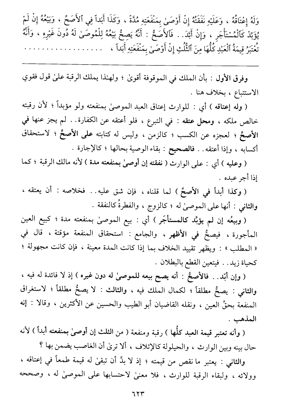(وإن أبّد .. فالأصحُّ: أنه يصح بيعه للموصى له دون غيره) إذ لا فائدة له فيه، والثاني: يصحُّ مطلقًا؛ لكمال الملك فيه، والثالث: لا يصحُّ مطلقًا؛ لاستغراق المنفعة بحقِّ العين، ونقله القاضيان أبو الطيب والحسين عن الأكثرين، وقالا: إنه المذهب.