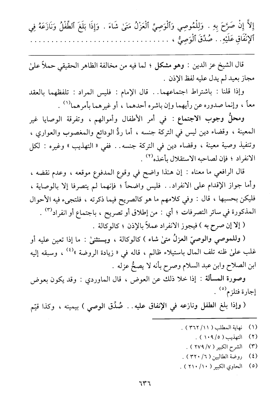 قال الرافعي ما معناه: إن هذا واضح في وقوع المدفوع موقعه، وعدم نقضه، وأما جواز الإقدام على الانفراد .. فليس واضحًا؛ فإنهما لم يتصرفا إلا بالوصاية، فليكن بحسبها، قال: وفي كلامهم ما هو كالصريح فيما ذكرته، فلتجئ فيه الأحوال المذكورة في سائر التصرفات؛ أي: من إطلاق أو تصريح، باجتماع أو انفراد (٣).