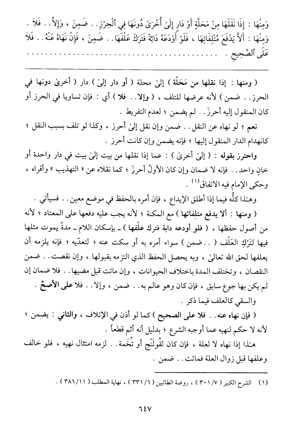واحترز بقوله: (إلى أخرى): عما إذا نقلها من بيت إلى بيت في دار واحدة أو خانٍ واحد .. فإنه لا ضمان وإن كان الأولُ أحرزَ؛ كما نقلاه عن "التهذيب" وأقراه، وحكى الإمام فيه الاتفاق (١).