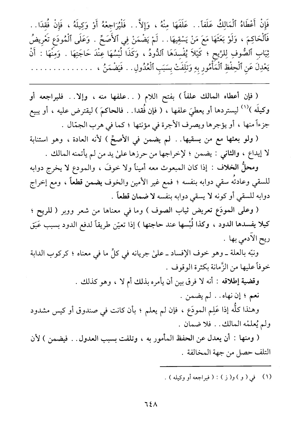 ومحلُّ الخلاف: إذا كان المبعوث معه أمينًا ولا خوفَ، والمودع لا يخرج دوابه للسقي وعادتُه سقي دوابه بنفسه؛ فمع غير الأمين والخوف يضمن قطعًا، ومع إخراج دوابه للسقي أو كونه لا يسقي دوابه بنفسه لا ضمان قطعًا.