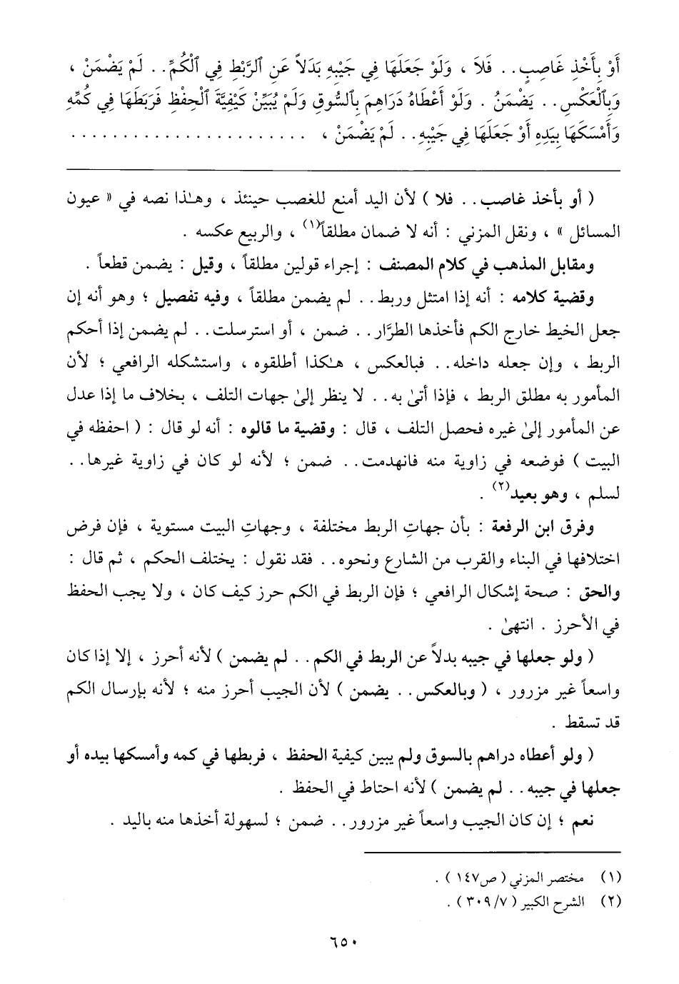 (ولو جعلها في جيبه بدلًا عن الربط في الكم .. لم يضمن) لأنه أحرز، إلا إذا كان واسعًا غير مزرور، ) (وبالعكس .. يضمن) لأن الجيب أحرز منه؛ لأنه بإرسال الكم قد تسقط.