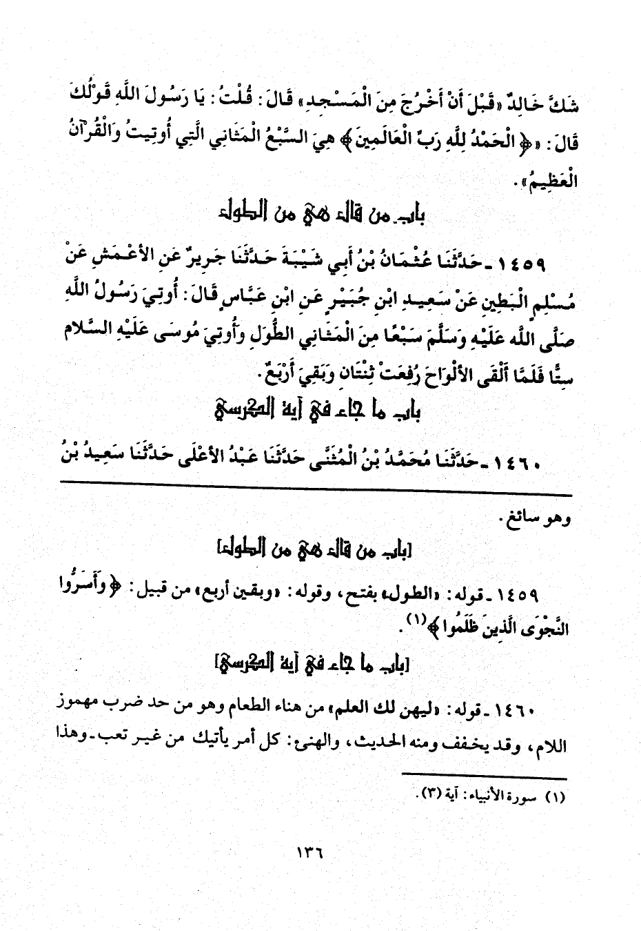 1459 - حَدَّثَنَا عُثْمَانُ بْنُ أَبِي شَيْبَةَ، حَدَّثَنَا جَرِيرٌ، عَنِ الْأَعْمَشِ، عَنْ مُسْلِمٍ الْبَطِينِ، عَنْ سَعِيدِ بْنِ جُبَيْرٍ، عَنِ ابْنِ عَبَّاسٍ، قَالَ: «أُوتِيَ رَسُولُ اللَّهِ صَلَّى اللهُ عَلَيْهِ وَسَلَّمَ سَبْعًا مِنَ المَثَانِي الطُّوَلِ، وَأُوتِيَ مُوسَى عَلَيْهِ السَّلَام سِتًّا، فَلَمَّا أَلْقَى الْأَلْوَاحَ، رُفِعَتْ ثِنْتَانِ، وَبَقِيَ أَرْبَعٌ».