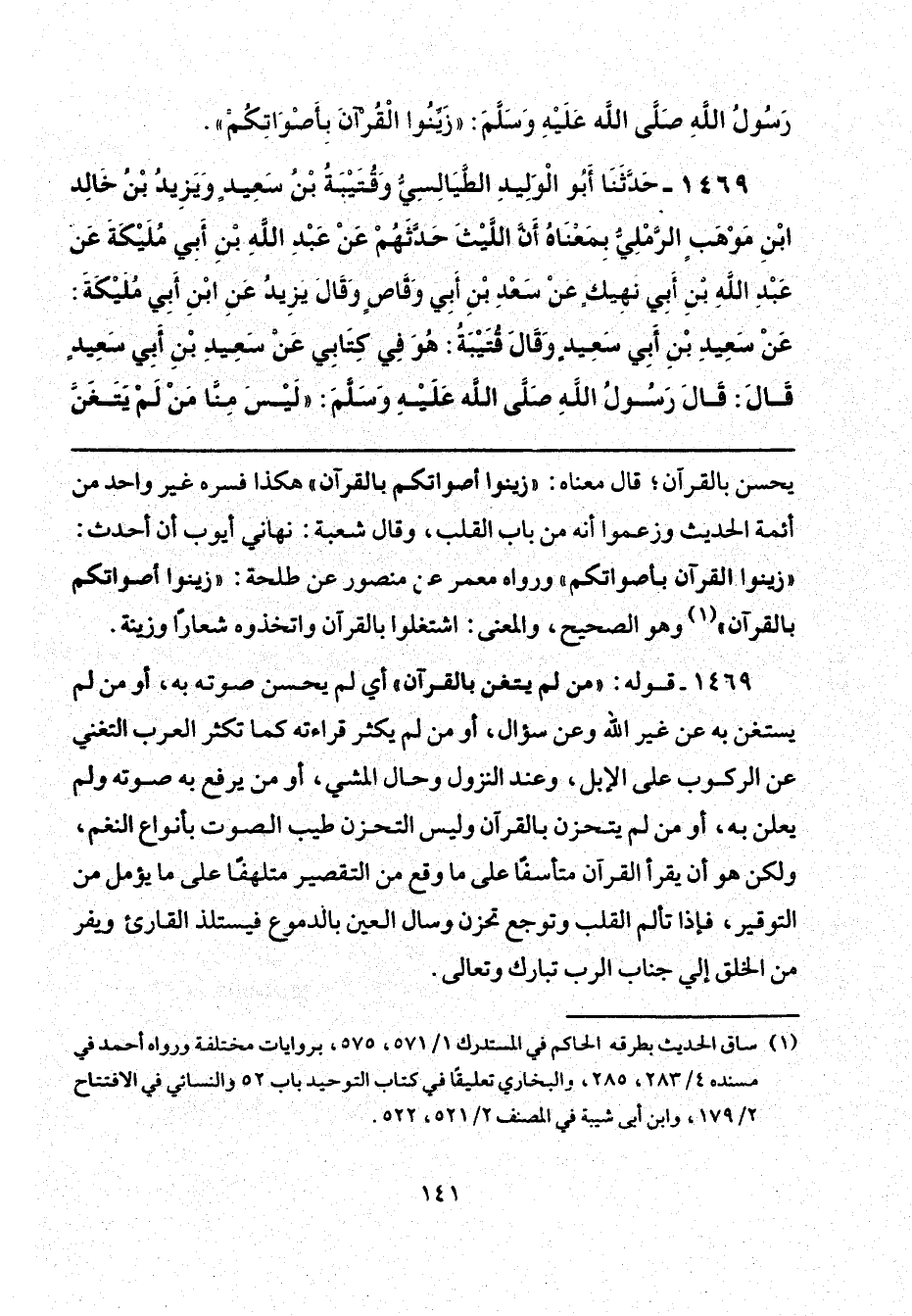 1469 - حَدَّثَنَا أَبُو الْوَلِيدِ الطَّيَالِسِيُّ، وَقُتَيْبَةُ بْنُ سَعِيدٍ، وَيَزِيدُ بْنُ خَالِدِ بْنِ مَوْهَبٍ الرَّمْلِيُّ، بِمَعْنَاهُ، أَنَّ اللَّيْثَ حَدَّثَهُمْ، عَنْ عَبْدِ اللَّهِ بْنِ أَبِي مُلَيْكَةَ، عَنْ عَبْدِ اللَّهِ بْنِ أَبِي نَهِيكٍ، عَنْ سَعْدِ بْنِ أَبِي وَقَّاصٍ - وَقَالَ: يَزِيدُ، عَنِ ابْنِ أَبِي مُلَيْكَةَ، عَنْ سَعِيدِ بْنِ أَبِي سَعِيدٍ. وَقَالَ قُتَيْبَةُ: هُوَ فِي كِتَابِي، عَنْ سَعِيدِ بْنِ أَبِي سَعِيدٍ - قَالَ قَالَ رَسُولُ اللَّهِ صَلَّى اللهُ عَلَيْهِ وَسَلَّمَ: «لَيْسَ مِنَّا مَنْ لَمْ يَتَغَنَّ