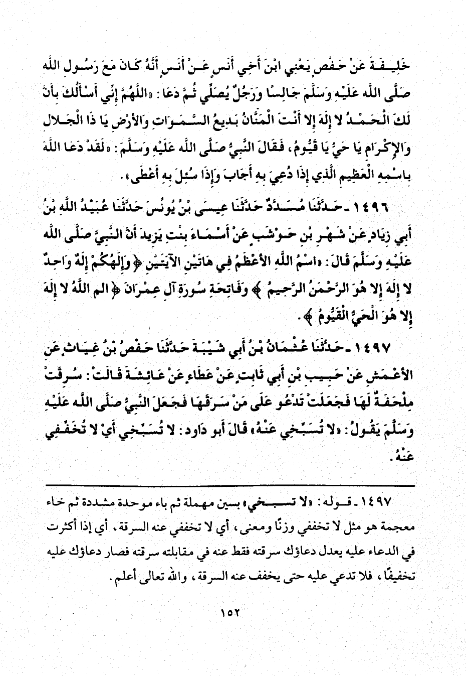 1497 - حَدَّثَنَا عُثْمَانُ بْنُ أَبِي شَيْبَةَ، حَدَّثَنَا حَفْصُ بْنُ غِيَاثٍ، عَنِ الْأَعْمَشِ، عَنْ حَبِيبِ بْنِ أَبِي ثَابِتٍ، عَنْ عَطَاءٍ، عَنْ عَائِشَةَ، قَالَتْ: سُرِقَتْ مِلْحَفَةٌ لَهَا، فَجَعَلَتْ تَدْعُو عَلَى مَنْ سَرَقَهَا، فَجَعَلَ النَّبِيُّ صَلَّى اللهُ عَلَيْهِ وَسَلَّمَ، يَقُولُ: «لَا تُسَبِّخِي عَنْهُ»، قَالَ أَبُو دَاوُدَ: لَا تُسَبِّخِي: أَيْ لَا تُخَفِّفِي.