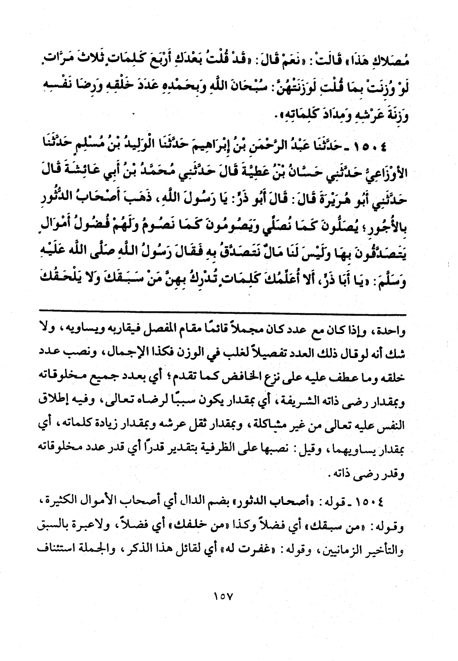 1504 - حَدَّثَنَا عَبْدُ الرَّحْمَنِ بْنُ إِبْرَاهِيمَ، حَدَّثَنَا الْوَلِيدُ بْنُ مُسْلِمٍ، حَدَّثَنَا الْأَوْزَاعِيُّ، حَدَّثَنِي حَسَّانُ بْنُ عَطِيَّةَ، قَالَ: حَدَّثَنِي مُحَمَّدُ بْنُ أَبِي عَائِشَةَ، قَالَ: حَدَّثَنِي أَبُو هُرَيْرَةَ، قَالَ: قَالَ أَبُو ذَرٍّ: يَا رَسُولَ اللَّهِ، ذَهَبَ أَصْحَابُ الدُّثُورِ بِالْأُجُورِ، يُصَلُّونَ كَمَا نُصَلِّي، وَيَصُومُونَ كَمَا نَصُومُ، وَلَهُمْ فُضُولُ أَمْوَالٍ يَتَصَدَّقُونَ بِهَا، وَلَيْسَ لَنَا مَالٌ نَتَصَدَّقُ بِهِ، فَقَالَ رَسُولُ اللَّهِ صَلَّى اللهُ عَلَيْهِ وَسَلَّمَ: «يَا أَبَا ذَرٍّ، أَلَا أُعَلِّمُكَ كَلِمَاتٍ تُدْرِكُ بِهِنَّ مَنْ سَبَقَكَ، وَلَا يَلْحَقُكَ