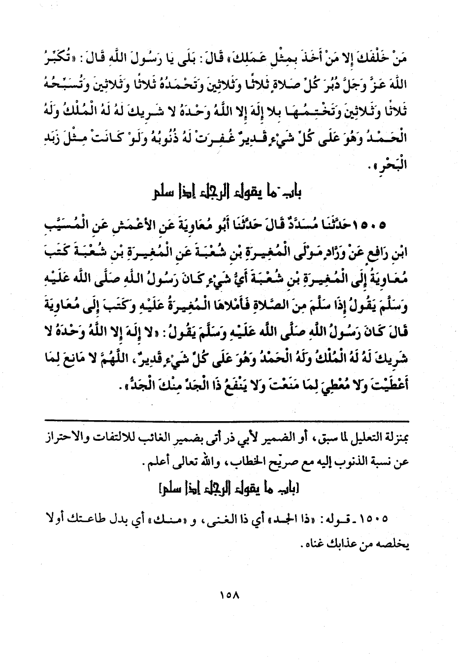 1505 - حَدَّثَنَا مُسَدَّدٌ، قَالَ: حَدَّثَنَا أَبُو مُعَاوِيَةَ، عَنِ الْأَعْمَشِ، عَنِ الْمُسَيَّبِ بْنِ رَافِعٍ، عَنْ وَرَّادٍ، مَوْلَى الْمُغِيرَةِ بْنِ شُعْبَةَ، عَنِ الْمُغِيرَةِ بْنِ شُعْبَةَ، كَتَبَ مُعَاوِيَةُ إِلَى الْمُغِيرَةِ بْنِ شُعْبَةَ، أَيُّ شَيْءٍ كَانَ رَسُولُ اللَّهِ صَلَّى اللهُ عَلَيْهِ وَسَلَّمَ يَقُولُ إِذَا سَلَّمَ مِنَ الصَّلَاةِ؟ فَأَمْلَاهَا الْمُغِيرَةُ عَلَيْهِ، وَكَتَبَ إِلَى مُعَاوِيَةَ، قَالَ: كَانَ رَسُولُ اللَّهِ صَلَّى اللهُ عَلَيْهِ وَسَلَّمَ يَقُولُ: «لَا إِلَهَ إِلَّا اللَّهُ وَحْدَهُ لَا شَرِيكَ لَهُ، لَهُ الْمُلْكُ، وَلَهُ الْحَمْدُ، وَهُوَ عَلَى كُلِّ شَيْءٍ قَدِيرٌ، اللَّهُمَّ لَا مَانِعَ لِمَا أَعْطَيْتَ، وَلَا مُعْطِيَ لِمَا مَنَعْتَ، وَلَا يَنْفَعُ ذَا الْجَدِّ مِنْكَ الْجَدُّ».