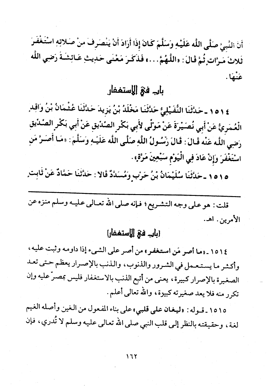 1514 - "ما أصر مَن استغفر" من أصر على الشيء إذا داومه وثبت عليه، وأكثر ما يستعمل في الشرور والذنوب، والذنب بالإصرار يعظم حتى تعد الصغيرة بالإصرار كبيرة، يعني من أتبع الذنب بالاستغفار فليس بمصرّ عليه وإن تكرر منه فلا يعد صغيرته كبيرة، والله تعالى أعلم.