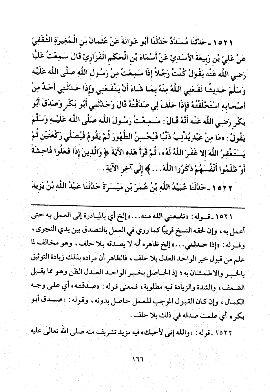 1521 - قوله: "نفعني الله منه ... " إلخ أي بالمبادرة إلى العمل به حتى أعمل به، وإن لحقه النسخ قريبًا كما روي في العمل بالتصدق بين يدي النجوى، وقوله: "إذا حدثني ... " إلخ ظاهره أنه لا يصدقه بلا حلف، وهو مخالف لما علم من قبول خبر الواحد العدل بلا حلف، فالظاهر أن مراده بذلك زيادة التوثيق بالخبر والاطمئنان به؛ إذ الحاصل بخبر الواحد العدل الظن وهو مما يقبل الضعف، والشدة والزيادة فيه مطلوبة، فمعنى قوله: "صدقته" أي على وجه الكمال، وإن كان القبول الموجب للعمل حاصل بدونه، وقوله: "صدق أبو بكر" أي علمت صدقه في ذلك بلا حلف.