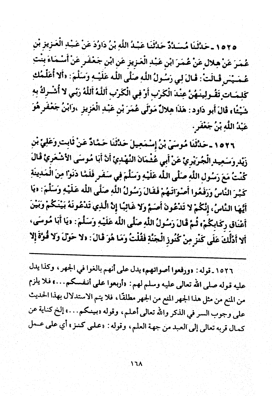 1526 - حَدَّثَنَا مُوسَى بْنُ إِسْمَاعِيلَ، حَدَّثَنَا حَمَّادٌ، عَنْ ثَابِتٍ، وَعَلِيِّ بْنِ زَيْدٍ، وَسَعِيدٍ الْجُرَيْرِيِّ، عَنْ أَبِي عُثْمَانَ النَّهْدِيِّ، أَنَّ أَبَا مُوسَى الْأَشْعَرِيَّ، قَالَ: كُنْتُ مَعَ رَسُولِ اللَّهِ صَلَّى اللهُ عَلَيْهِ وَسَلَّمَ فِي سَفَرٍ، فَلَمَّا دَنَوْا مِنَ الْمَدِينَةِ كَبَّرَ النَّاسُ، وَرَفَعُوا أَصْوَاتَهُمْ، فَقَالَ رَسُولُ اللَّهِ صَلَّى اللهُ عَلَيْهِ وَسَلَّمَ: «يَا أَيُّهَا النَّاسُ، إِنَّكُمْ لَا تَدْعُونَ أَصَمَّ، وَلَا غَائِبًا، إِنَّ الَّذِي تَدْعُونَهُ بَيْنَكُمْ وَبَيْنَ أَعْنَاقِ رِكَابِكُمْ»، ثُمَّ قَالَ رَسُولُ اللَّهِ صَلَّى اللهُ عَلَيْهِ وَسَلَّمَ: «يَا أَبَا مُوسَى، أَلَا أَدُلُّكَ عَلَى كَنْزٍ مِنْ كُنُوزِ الْجَنَّةِ؟ » فَقُلْتُ، وَمَا هُوَ؟ قَالَ: «لَا حَوْلَ وَلَا قُوَّةَ إِلَّا