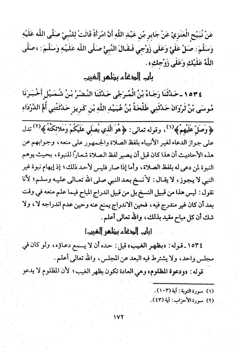 {وَصَلِّ عَلَيهِمْ} (¬1)، وقوله تعالى: {هُوَ الَّذِي يُصَلِّي عَلَيكُمْ وَمَلَائِكَتُهُ} (¬2) تدل على جواز الدعاء لغير الأنبياء بلفظ الصلاة والجمهور على منعه، وجوابهم عن هذه الأحاديث أن هذا كان قبل أن يصير لفظ الصلاة شعارًا للنبوة، بحيث يوهم النبوة لمن دعى له بلفظ الصلاة، وأما إذا صار فليس لأحد ذلك؛ إذ إيهام نبوة غير النبي لا يجوز، لا يقال: لا نسخ بعد النبي صلى الله تعالى عليه وسلم؛ لأنا نقول: ليس هذا من قبيل النسخ بل من قبيل اندراج المباح فيما علم منعه في وقت بعد أن كان غير مندرج فيه، فحين الاندراج يمنع عنه وحين عدم اندراجه لا، ولا شك أن كل مباح مقيد بذلك، والله تعالى أعلم.