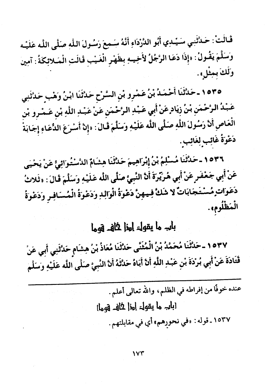 1536 - حَدَّثَنَا مُسْلِمُ بْنُ إِبْرَاهِيمَ، حَدَّثَنَا هِشَامٌ الدَّسْتُوَائِيُّ، عَنْ يَحْيَى، عَنْ أَبِي جَعْفَرٍ، عَنْ أَبِي هُرَيْرَةَ، أَنَّ النَّبِيَّ صَلَّى اللهُ عَلَيْهِ وَسَلَّمَ قَالَ: ثَلَاثُ دَعَوَاتٍ مُسْتَجَابَاتٌ لَا شَكَّ فِيهِنَّ: دَعْوَةُ الْوَالِدِ، وَدَعْوَةُ الْمُسَافِرِ، وَدَعْوَةُ الْمَظْلُومِ.