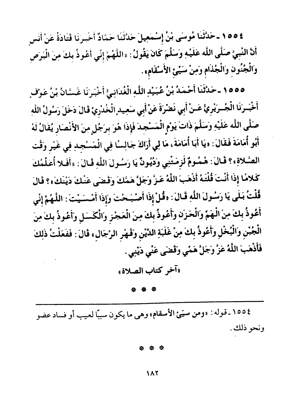 1554 - حَدَّثَنَا مُوسَى بْنُ إِسْمَاعِيلَ، حَدَّثَنَا حَمَّادٌ، أَخْبَرَنَا قَتَادَةُ، عَنْ أَنَسٍ، أَنَّ النَّبِيَّ صَلَّى عَلَيْهِ وَسَلَّمَ كَانَ يَقُولُ: «اللَّهُمَّ إِنِّي أَعُوذُ بِكَ مِنَ البَرَصِ، وَالْجُنُونِ، وَالْجُذَامِ، وَمِنْ سَيِّئِ الْأَسْقَامِ».