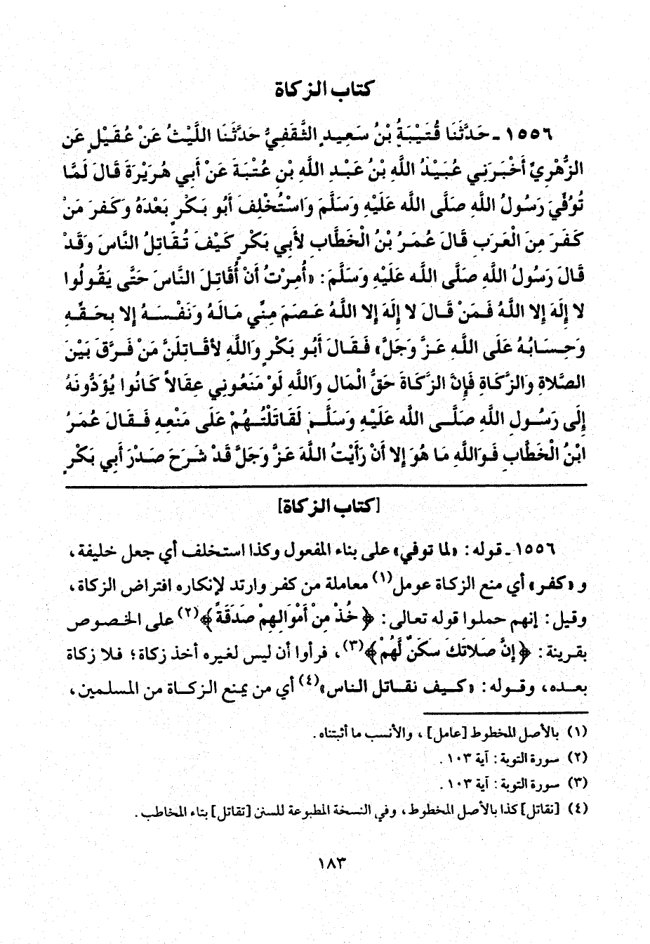 1556 - قوله: "لما توفي" على بناء المفعول وكذا استخلف أي جعل خليفة، و "كفر" أي منع الزكاة عومل (¬1) معاملة من كفر وارتد لإنكاره افتراض الزكاة، وقيل: إنهم حملوا قوله تعالى: {خُذْ مِنْ أَمْوَالِهِمْ صَدَقَةً} (¬2) على الخصوص بقرينة: {إِنَّ صَلَاتَكَ سَكَنٌ لَهُمْ} (¬3)؛ فرأوا أن ليس لغيره أخذ زكاة؛ فلا زكاة بعده، وقوله: "كيف نقاتل الناس" (¬4) أي من يمنع الزكاة من المسلمين،