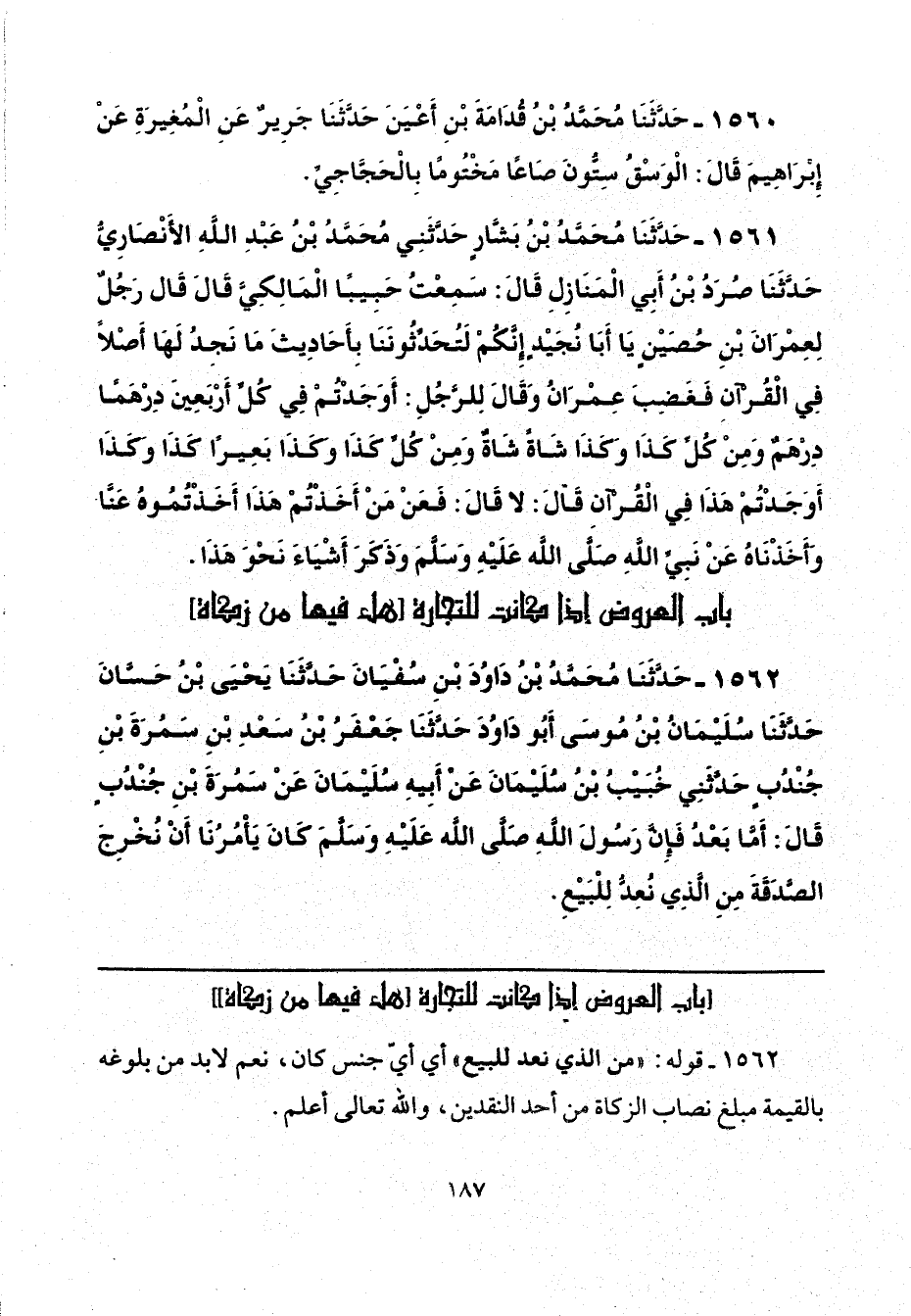 1561 - حَدَّثَنَا مُحَمَّدُ بْنُ بَشَّارٍ، حَدَّثَنِي مُحَمَّدُ بْنُ عَبْدِ اللَّهِ الْأَنْصَارِيُّ، حَدَّثَنَا صُرَدُ بْنُ أَبِي الْمَنَازِلِ، قَالَ: سَمِعْتُ حَبِيبًا الْمَالِكِيَّ، قَالَ: قَالَ رَجُلٌ لِعِمْرَانَ بْنِ حُصَيْنٍ: يَا أَبَا نُجَيْدٍ، إِنَّكُمْ لَتُحَدِّثُونَنَا بِأَحَادِيثَ مَا نَجِدُ لَهَا أَصْلًا فِي الْقُرْآنِ، فَغَضِبَ عِمْرَانُ، وَقَالَ لِلرَّجُلِ: «أَوَجَدْتُمْ فِي كُلِّ أَرْبَعِينَ دِرْهَمًا دِرْهَمًا، وَمِنْ كُلِّ كَذَا وَكَذَا شَاةً شَاةً، وَمِنْ كُلِّ كَذَا وَكَذَا بَعِيرًا كَذَا وَكَذَا، أَوَجَدْتُمْ هَذَا فِي الْقُرْآنِ؟ » قَالَ: لَا، قَالَ: «فَعَنْ مَنْ أَخَذْتُمْ هَذَا؟ أَخَذْتُمُوهُ عَنَّا، وَأَخَذْنَاهُ عَنْ نَبِيِّ اللَّهِ صَلَّى اللهُ عَلَيْهِ وَسَلَّمَ»، وَذَكَرَ أَشْيَاءَ نَحْوَ هَذَا.