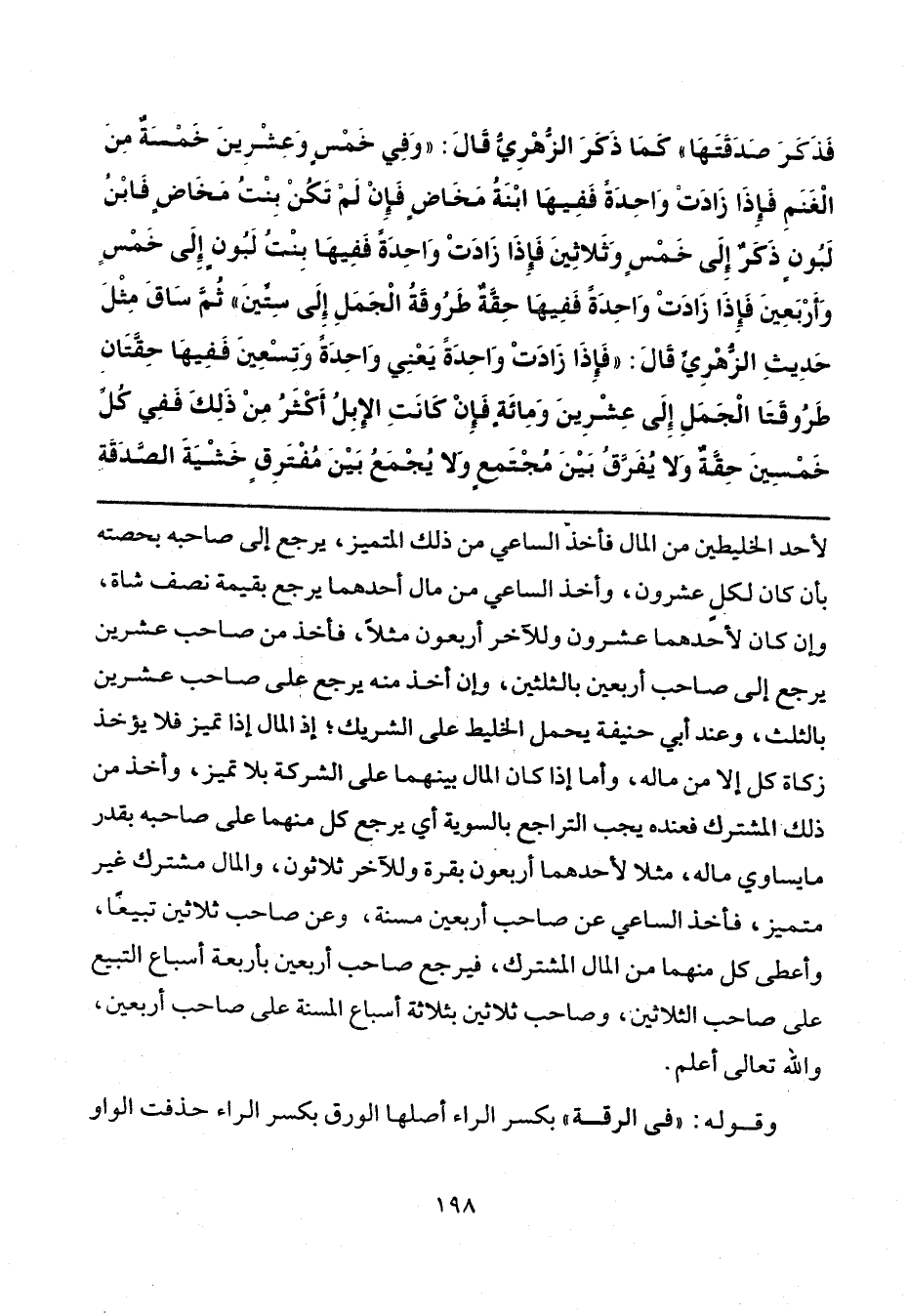 فَذَكَرَ صَدَقَتَهَا كَمَا ذَكَرَ الزُّهْرِيُّ - قَالَ: «وَفِي خَمْسٍ وَعِشْرِينَ خَمْسَةٌ مِنَ الْغَنَمِ، فَإِذَا زَادَتْ وَاحِدَةً فَفِيهَا ابْنَةُ مَخَاضٍ، فَإِنْ لَمْ تَكُنْ بِنْتُ مَخَاضٍ، فَابْنُ لَبُونٍ ذَكَرٌ إِلَى خَمْسٍ وَثَلَاثِينَ، فَإِذَا زَادَتْ وَاحِدَةً، فَفِيهَا بِنْتُ لَبُونٍ إِلَى خَمْسٍ وَأَرْبَعِينَ، فَإِذَا زَادَتْ وَاحِدَةً، فَفِيهَا حِقَّةٌ طَرُوقَةُ الْجَمَلِ إِلَى سِتِّينَ» - ثُمَّ سَاقَ مِثْلَ حَدِيثِ الزُّهْرِيِّ - قَالَ: «فَإِذَا زَادَتْ وَاحِدَةً يَعْنِي وَاحِدَةً وَتِسْعِينَ، فَفِيهَا حِقَّتَانِ طَرُوقَتَا الْجَمَلِ إِلَى عِشْرِينَ وَمِائَةٍ، فَإِنْ كَانَتِ الْإِبِلُ أَكْثَرُ مِنْ ذَلِكَ، فَفِي كُلِّ خَمْسِينَ حِقَّةٌ، وَلَا يُفَرَّقُ بَيْنَ مُجْتَمِعٍ، وَلَا يُجْمَعُ بَيْنَ مُفْتَرِقٍ خَشْيَةَ الصَّدَقَةِ،