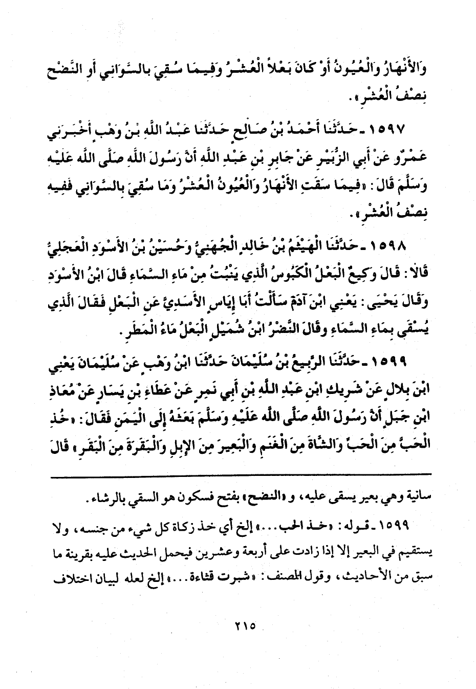 1597 - حَدَّثَنَا أَحْمَدُ بْنُ صَالِحٍ، حَدَّثَنَا عَبْدُ اللَّهِ بْنُ وَهْبٍ، أَخْبَرَنِي عَمْرٌو، عَنْ أَبِي الزُّبَيْرِ، عَنْ جَابِرِ بْنِ عَبْدِ اللَّهِ، أَنَّ رَسُولَ اللَّهِ صَلَّى اللهُ عَلَيْهِ وَسَلَّمَ قَالَ: «فِيمَا سَقَتِ الْأَنْهَارُ وَالْعُيُونُ الْعُشْرُ، وَمَا سُقِيَ بِالسَّوَانِي فَفِيهِ نِصْفُ الْعُشْرِ».