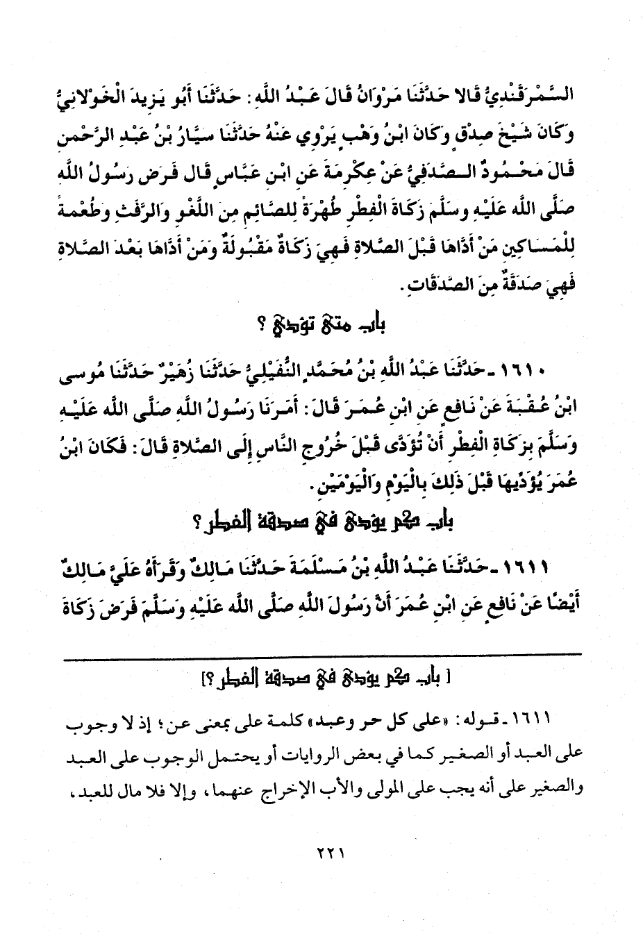 1611 - قوله: "على كل حر وعبد" كلمة على بمعنى عن؛ إذ لا وجوب على العبد أو الصغير كما في بعض الروايات أو يحتمل الوجوب على العبد والصغير على أنه يجب على المولى والأب الإخراج عنهما، وإلا فلا مال للعبد،