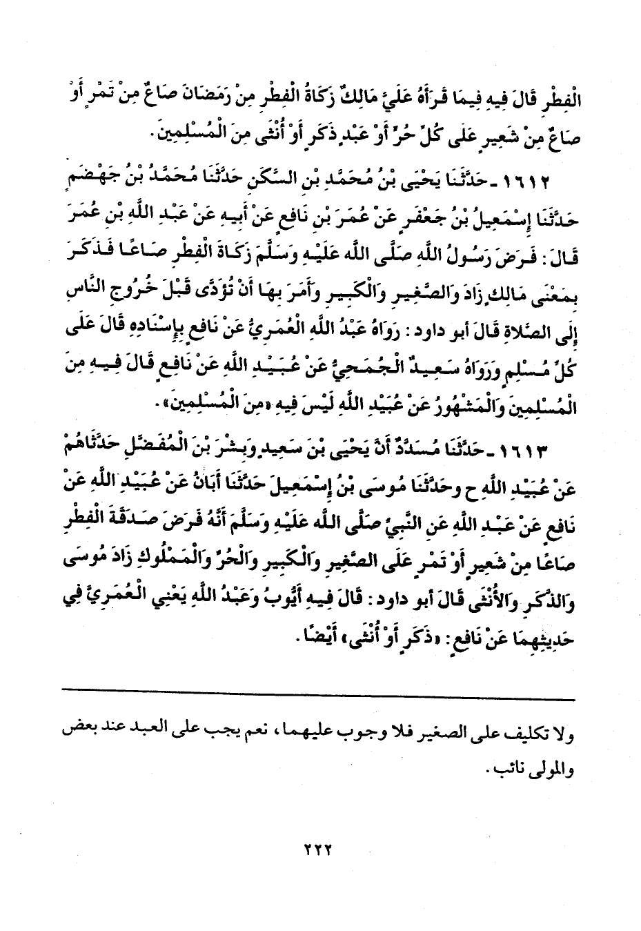 1613 - حَدَّثَنَا مُسَدَّدٌ، أَنَّ يَحْيَى بْنَ سَعِيدٍ، وَبِشْرَ بْنَ الْمُفَضَّلِ، حَدَّثَاهُمْ، عَنْ عُبَيْدِ اللَّهِ، ح وحَدَّثَنَا مُوسَى بْنُ إِسْمَاعِيلَ، حَدَّثَنَا أَبَانُ، عَنْ عُبَيْدِ اللَّهِ، عَنْ نَافِعٍ، عَنْ عَبْدِ اللَّهِ، عَنِ النَّبِيِّ صَلَّى اللهُ عَلَيْهِ وَسَلَّمَ، «أَنَّهُ فَرَضَ صَدَقَةَ الْفِطْرِ صَاعًا مِنْ شَعِيرٍ، أَوْ تَمْرٍ، عَلَى الصَّغِيرِ وَالْكَبِيرِ، وَالْحُرِّ وَالْمَمْلُوكِ»، زَادَ مُوسَى: وَالذَّكَرِ وَالْأُنْثَى، قَالَ أَبُو دَاوُدَ: قَالَ فِيهِ أَيُّوبُ، وَعَبْدُ اللَّهِ يَعْنِي الْعُمَرِيَّ، فِي حَدِيثِهِمَا عَنْ نَافِعٍ، ذَكَرٍ أَوْ أُنْثَى أَيْضًا.