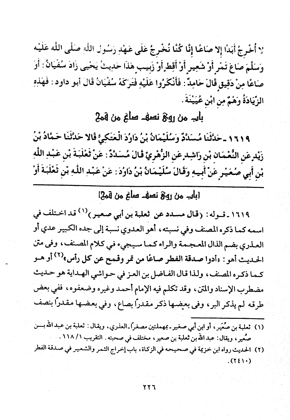 1619 - قوله: (قال مسدد عن ثعلبة بن أبي صعير) (¬1) قد اختلف في اسمه كما ذكره المصنف وفي نسبته، أهو العدوي نسبة إلى جده الكبير عدي أو العذري بضم الذال المعجمة والراء كما سيجيء في كلام المصنف، وفي متن الحديث أهو: "أدوا صدقة الفطر صاعًا من تمر وقمح عن كل رأس" (¬2) أو هو كما ذكره المصنف، ولذا قال الفاضل بن العز في حواشي الهداية هو حديث مضطرب الإسناد والمتن، وقد تكلم فيه الإمام أحمد وغيره وضعفوه، ففي بعض طرقه لم يذكر البر، وفي بعضمها ذكر مقدرًا بصاع، وفي بعضهما مقدرًا بنصف