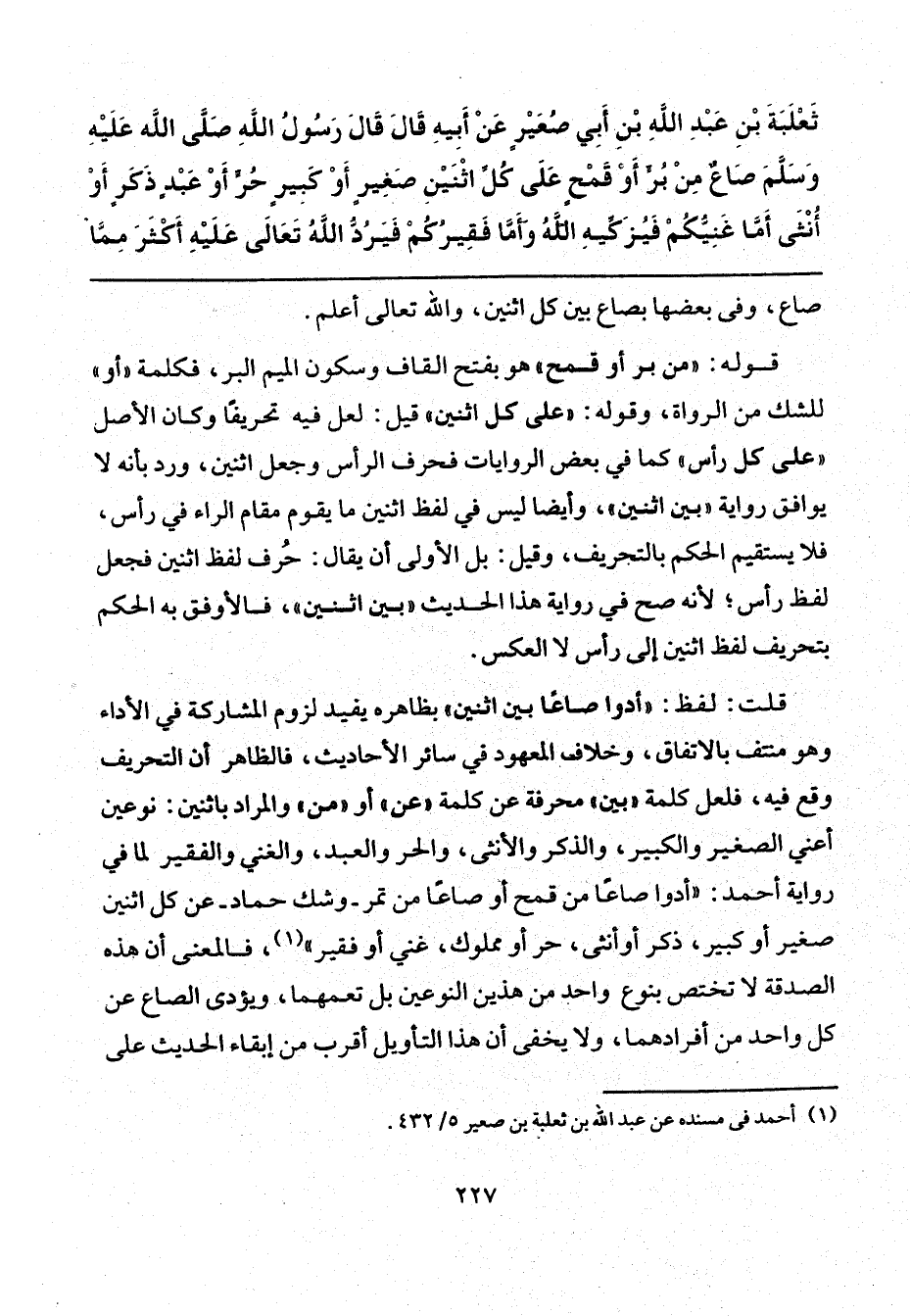 قلت: لفظ: "أدوا صاعًا بين اثنين" بظاهره يقيد لزوم المشاركة في الأداء وهو منتف بالاتفاق، وخلاف المعهود في سائر الأحاديث، فالظاهر أن التحريف وقع فيه، فلعل كلمة "بين" محرفة عن كلمة "عن" و "من" والمراد باثنين: نوعين أعني الصغير والكبير، والذكر والأنثى، والحر والعبد، والغني والفقير لما في رواية أحمد: "أدوا صاعًا من قمح أو صاعًا من تمر -وشك حماد- عن كل اثنين صغير أو كبير، ذكر أو أنثى، حر أو مملوك، غني أو فقير" (¬1)، فالمعنى أن هذه الصدقة لا تختص بنوع واحدٍ من هذين النوعين بل تعمهما، ويؤدى الصاع عن كل واحد من أفرادهما، ولا يخفى أن هذا التأويل أقرب من إبقاء الحديث على