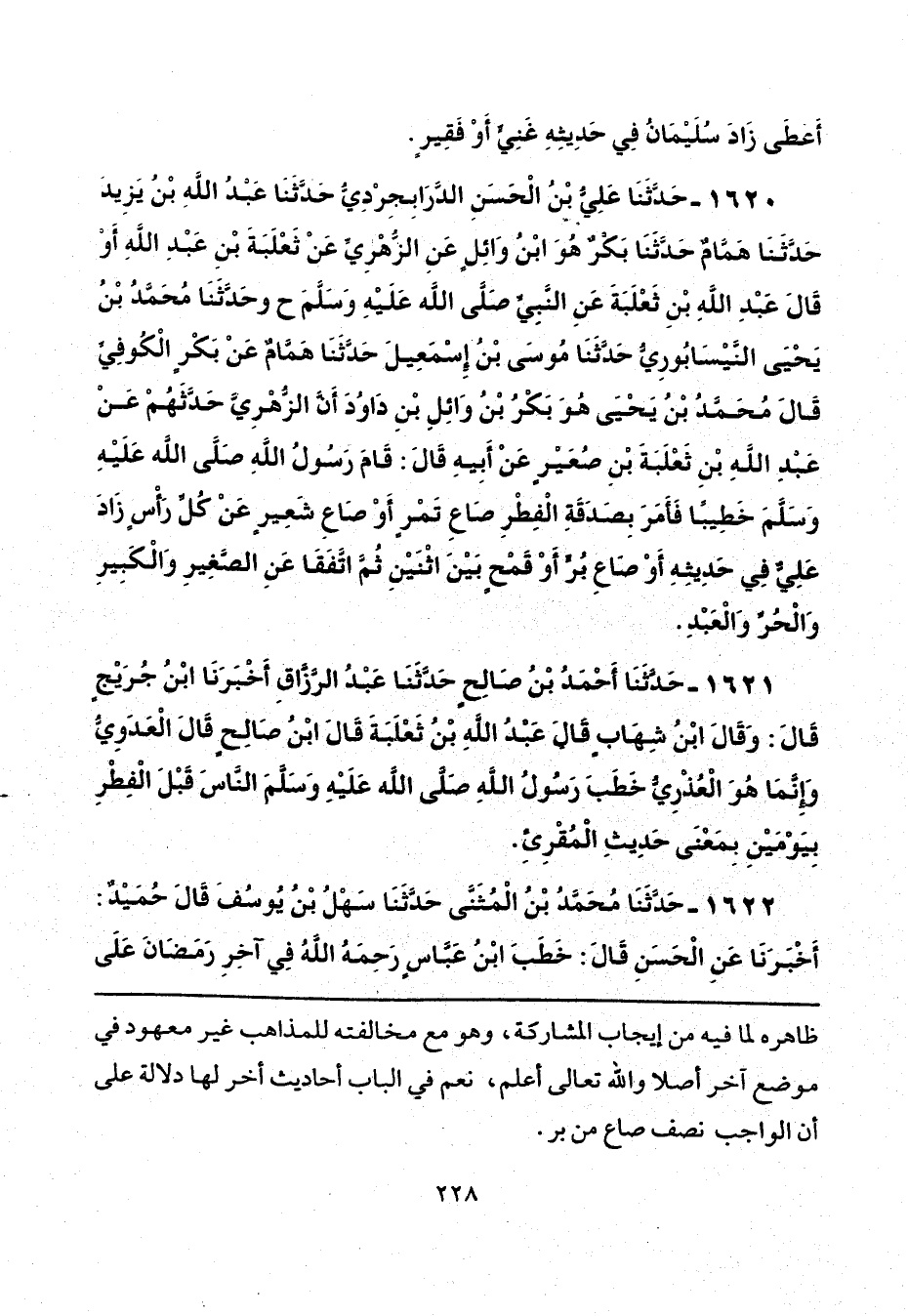1620 - حَدَّثَنَا عَلِيُّ بْنُ الْحَسَنِ الدَّارَابَجِرْدِيُّ، حَدَّثَنَا عَبْدُ اللَّهِ بْنُ يَزِيدَ، حَدَّثَنَا هَمَّامٌ، حَدَّثَنَا بَكْرٌ هُوَ ابْنُ وَائِلٍ، عَنِ الزُّهْرِيِّ، عَنْ ثَعْلَبَةَ بْنِ عَبْدِ اللَّهِ، أَوْ قَالَ: عَبْدِ اللَّهِ بْنِ ثَعْلَبَةَ، عَنِ النَّبِيِّ صَلَّى اللهُ عَلَيْهِ وَسَلَّمَ، ح وحَدَّثَنَا مُحَمَّدُ بْنُ يَحْيَى النَّيْسَابُورِيُّ، حَدَّثَنَا مُوسَى بْنُ إِسْمَاعِيلَ، حَدَّثَنَا هَمَّامٌ، عَنْ بَكْرٍ الْكُوفِيِّ - قَالَ: مُحَمَّدُ بْنُ يَحْيَى هُوَ بَكْرُ بْنُ وَائِلِ بْنِ دَاوُدَ - أَنَّ الزُّهْرِيَّ، حَدَّثَهُمْ عَنْ عَبْدِ اللَّهِ بْنِ ثَعْلَبَةَ بْنِ صُعَيْرٍ، عَنْ أَبِيهِ، قَالَ: "قَامَ رَسُولُ اللَّهِ صَلَّى اللهُ عَلَيْهِ وَسَلَّمَ خَطِيبًا، فَأَمَرَ بِصَدَقَةِ الْفِطْرِ، صَاعِ تَمْرٍ، أَوْ صَاعِ شَعِيرٍ، عَنْ كُلِّ رَأْسٍ - زَادَ عَلِيٌّ فِي حَدِيثِهِ: «أَوْ صَاعِ بُرٍّ، أَوْ قَمْحٍ بَيْنَ اثْنَيْنِ»، ثُمَّ اتَّفَقَا - عَنِ الصَّغِيرِ وَالْكَبِيرِ، وَالْحُرِّ وَالْعَبْدِ.