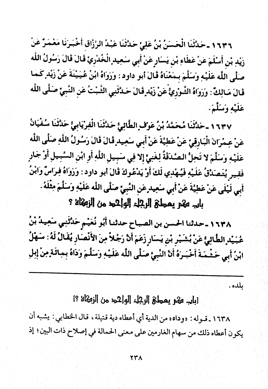 1636 - حَدَّثَنَا الْحَسَنُ بْنُ عَلِيٍّ، حَدَّثَنَا عَبْدُ الرَّزَّاقِ، أَخْبَرَنَا مَعْمَرٌ، عَنْ زَيْدِ بْنِ أَسْلَمَ، عَنْ عَطَاءِ بْنِ يَسَارٍ، عَنْ أَبِي سَعِيدٍ الْخُدْرِيِّ، قَالَ: قَالَ رَسُولُ اللَّهِ صَلَّى اللهُ عَلَيْهِ وَسَلَّمَ: بِمَعْنَاهُ، قَالَ أَبُو دَاوُدَ: وَرَوَاهُ ابْنُ عُيَيْنَةَ، عَنْ زَيْدٍ، كَمَا قَالَ مَالِكٌ: وَرَوَاهُ الثَّوْرِيُّ، عَنْ زَيْدٍ، قَالَ: حَدَّثَنِي الثَّبْتُ، عَنِ النَّبِيِّ صَلَّى اللهُ عَلَيْهِ وَسَلَّمَ.