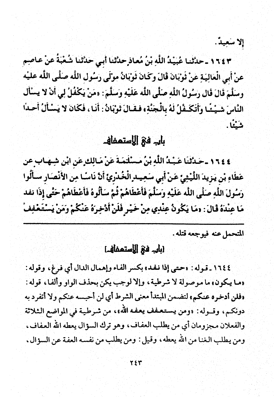 1644 - قوله: "حتى إذا نفد" بكسر الفاء وإهمال الدال أي فرغ، وقوله: "ما يكون" ما موصولة لا شرطية، وإلا لوجب يكن بحذف الواو وألفا، قوله: "فلن أدخره عنكم" لتضمن المبتدأ معنى الشرط أي لن أحبسه عنكم ولا أتفرد به دونكم، وقوله: "ومن يستعفف يعفه الله"، من شرطية في المواضع الثلاثة والفعلان مجزومان أي من يطلب العفاف، وهو ترك السؤال يعطه الله العفاف، ومن يطلب الغنا من الله يعطه، وقيل: ومن يطلب من نفسه العفة عن السؤال،