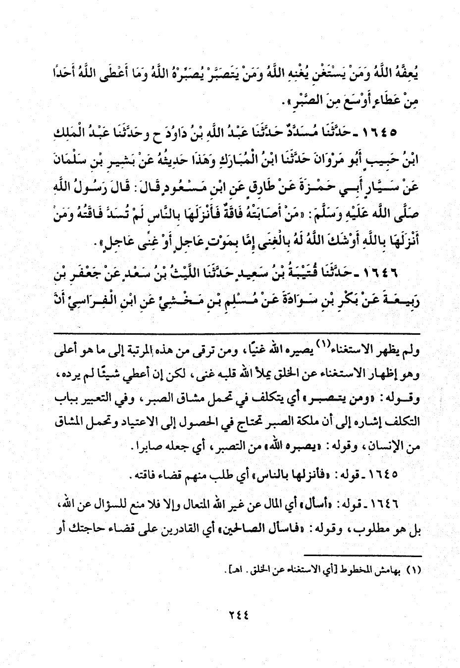 1646 - قوله: "أسأل" أي المال عن غير الله المتعال وإلا فلا منع للسؤال عن الله، بل هو مطلوب، وقوله: "فاسأل الصالحين" أي القادرين على قضاء حاجتك أو