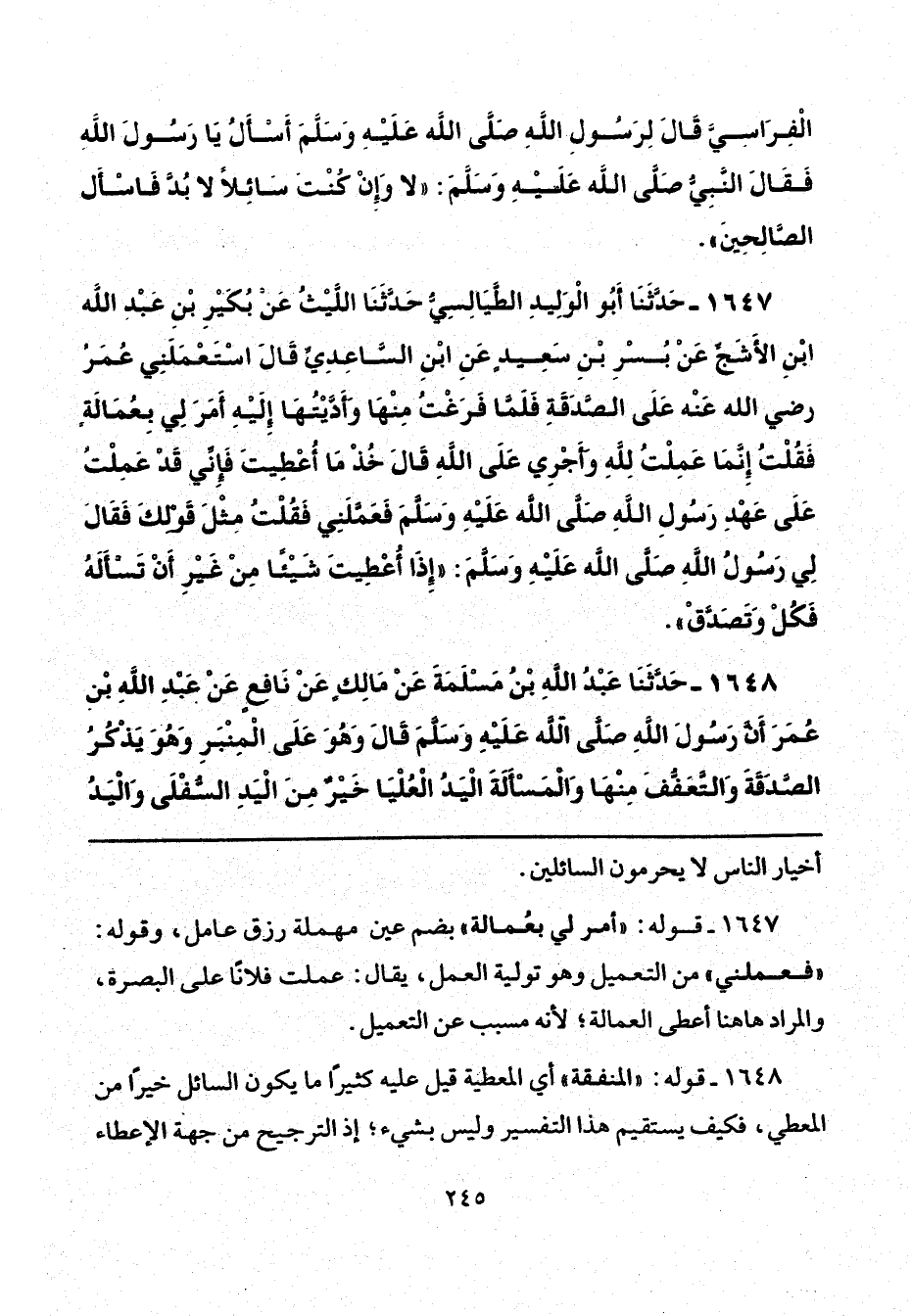 1647 - حَدَّثَنَا أَبُو الْوَلِيدِ الطَّيَالِسِيُّ، حَدَّثَنَا اللَّيْثُ، عَنْ بُكَيْرِ بْنِ عَبْدِ اللَّهِ بْنِ الْأَشَجِّ، عَنْ بُسْرِ بْنِ سَعِيدٍ، عَنِ ابْنِ السَّاعِدِيِّ، قَالَ: اسْتَعْمَلَنِي عُمَرُ رَضِيَ اللَّهُ عَنْهُ عَلَى الصَّدَقَةِ، فَلَمَّا فَرَغْتُ مِنْهَا وَأَدَّيْتُهَا إِلَيْهِ، أَمَرَ لِي بِعُمَالَةٍ، فَقُلْتُ: إِنَّمَا عَمِلْتُ لِلَّهِ وَأَجْرِي عَلَى اللَّهِ، قَالَ: خُذْ مَا أُعْطِيتَ، فَإِنِّي قَدْ عَمِلْتُ عَلَى عَهْدِ رَسُولِ اللَّهِ صَلَّى اللهُ عَلَيْهِ وَسَلَّمَ فَعَمَّلَنِي، فَقُلْتُ مِثْلَ قَوْلِكَ، فَقَالَ لِي رَسُولُ اللَّهِ صَلَّى اللهُ عَلَيْهِ وَسَلَّمَ: «إِذَا أُعْطِيتَ شَيْئًا مِنْ غَيْرِ أَنْ تَسْأَلَهُ، فَكُلْ وَتَصَدَّقْ».