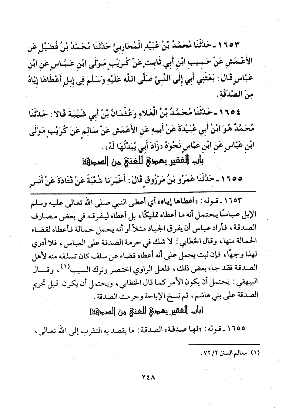 1653 - قوله: "أعطاها إياه" أي أعطى النبي صلى الله تعالى عليه وسلم الإبل عباسًا يحتمل أنه ما أعطاه تمليكًا، بل أعطاه ليفرقه في بعض مصارف الصدقة، فأراد عباس أن يفرق الجياد مثلًا أو أنه يحمل حمالة فأعطاه لقضاء الحمالة منها، وقال الخطابي لا شك في حرمة الصدقة على العباس، فلا أدري لهذا وجهًا، فإن ثبت يحمل على أنه أعطاه قضاء عن سلف كان تسلفه منه لأهل الصدقة فقد جاء بعض ذلك، فلعل الراوي اختصر وترك السبب (¬1)، وقال البيهقي: يحتمل أن يكون الأمر كما قال الخطابي، ويحتمل أن يكون قبل تحريم الصدقة على بني هاشم، ثم نسخ الإباحة وحرمت الصدقة.