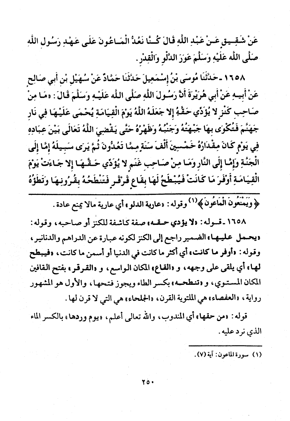 1658 - قوله: "لا يؤدي حقه" صفة كاشفة للكنز أو صاحبه، وقوله: "يحمل عليها" الضمير راجع إلى الكنز لكونه عبارة عن الدراهم والدنانير، وقوله: "أوفر ما كانت" أي أكثر ما كانت في الدنيا أو أسمن ما كانت، "فيبطح لها" أي يلقى على وجهه، و "القاع" المكان الواسع، و "القرقر" بفتح القافين المكان المستوي، و "تنطحه" بكسر الطاء ويجوز فتحها، والأول هو المشهور رواية، "العفصاء" هي الملتوية القرن، "الجلحاء" هي التي لا قرن لها.