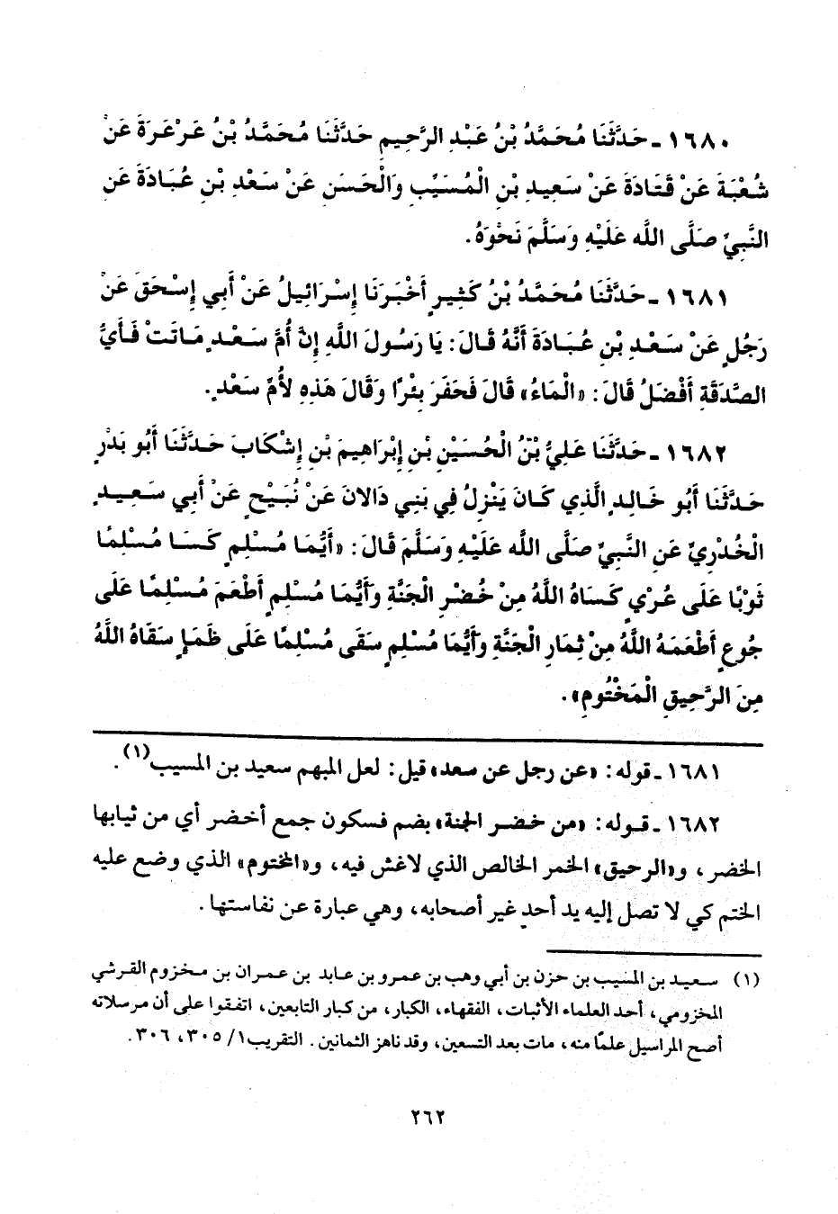 (¬1) سعيد بن المسيب بن حزن بن أبي وهب بن عمرو بن عابد بن عمران بن مخزوم القرشي المخزومي، أحد العلماء الأثبات، الفقهاء، الكبار، من كبار التابعين، اتفقوا على أن مرسلاته أصح المراسيل علمًا منه، مات بعد التسعين، وقد ناهز الثمانين. التقريب 1/ 305، 306.