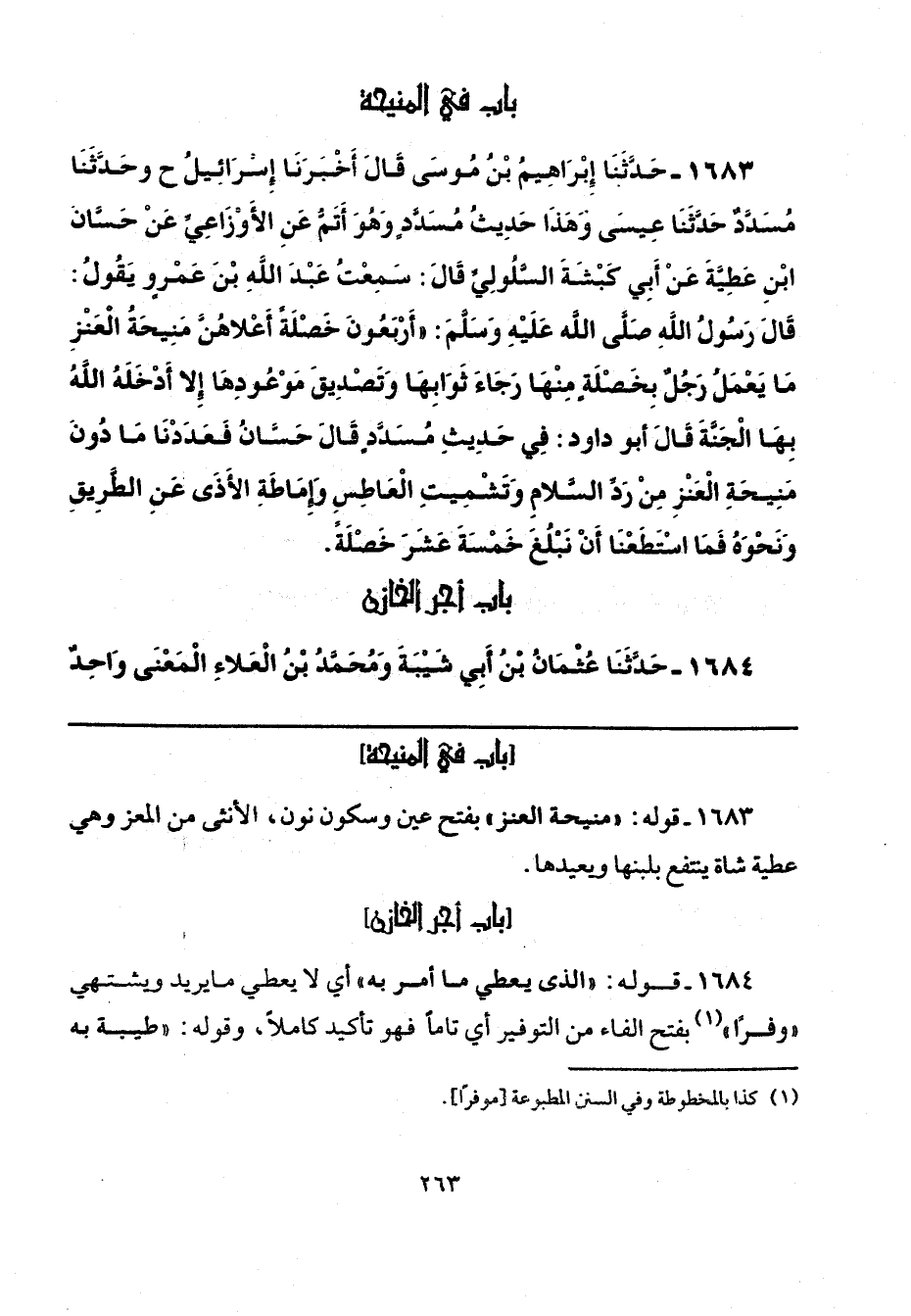 1683 - قوله: "منيحة العنز" بفتح عين وسكون نون، الأنثى من المعز وهي عطية شاة ينتفع بلبنها ويعيدها.