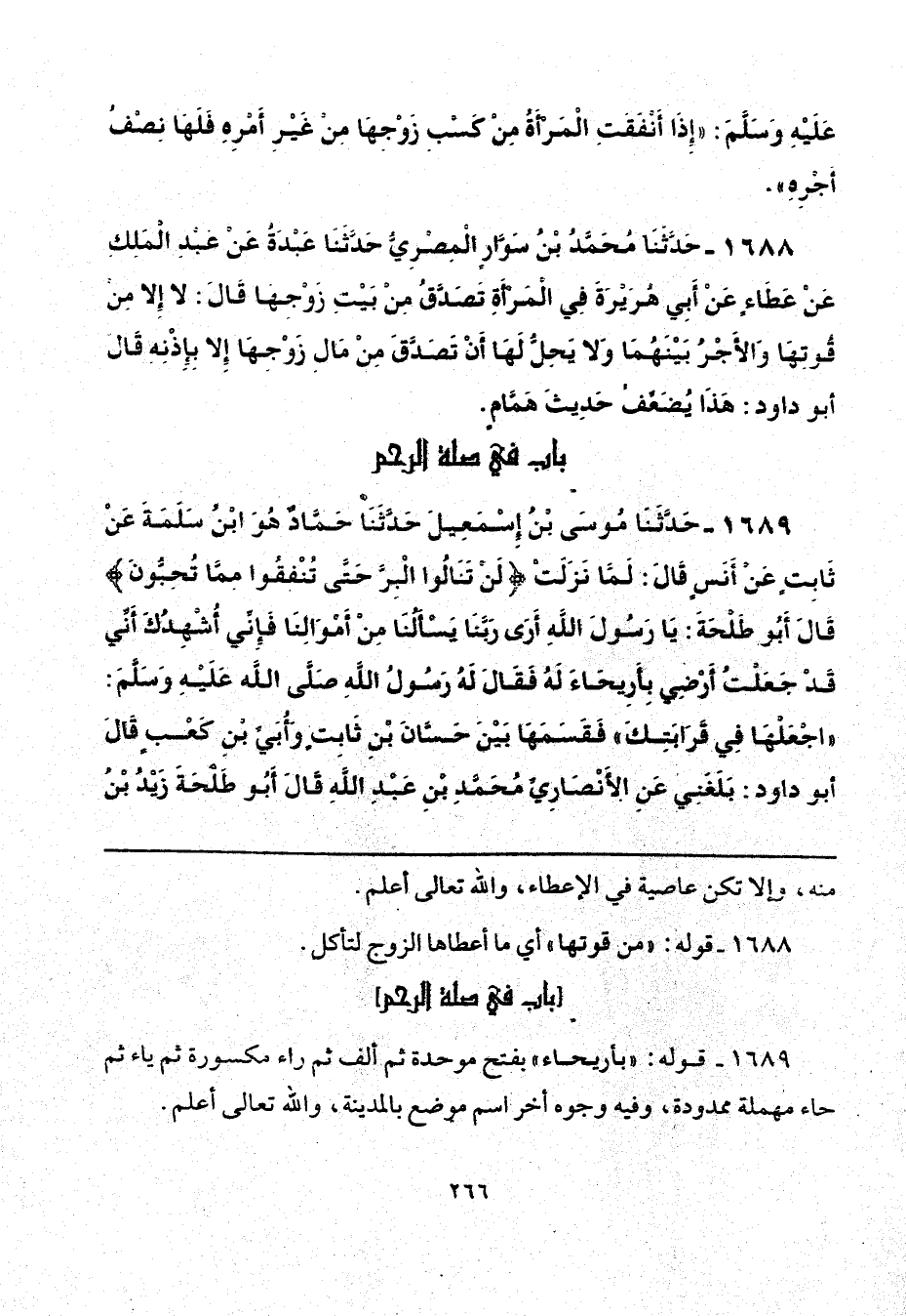 1689 - حَدَّثَنَا مُوسَى بْنُ إِسْمَاعِيلَ، حَدَّثَنَا حَمَّادٌ هُوَ ابْنُ سَلَمَةَ، عَنْ ثَابِتٍ، عَنْ أَنَسٍ، قَالَ: لَمَّا نَزَلَتْ {لَنْ تَنَالُوا الْبِرَّ حَتَّى تُنْفِقُوا مِمَّا تُحِبُّونَ} [آل عمران: 92]، قَالَ أَبُو طَلْحَةَ: يَا رَسُولَ اللَّهِ، أَرَى رَبَّنَا يَسْأَلُنَا مِنْ أَمْوَالِنَا، فَإِنِّي أُشْهِدُكَ أَنِّي قَدْ جَعَلْتُ أَرْضِي بِأَرِيحَاءَ لَهُ فَقَالَ لَهُ رَسُولُ اللَّهِ صَلَّى اللهُ عَلَيْهِ وَسَلَّمَ: «اجْعَلْهَا فِي قَرَابَتِكَ»، فَقَسَمَهَا بَيْنَ حَسَّانَ بْنِ ثَابِتٍ، وَأُبَيِّ بْنِ كَعْبٍ، قَالَ أَبُو دَاوُدَ: بَلَغَنِي عَنِ الْأَنْصَارِيِّ مُحَمَّدِ بْنِ عَبْدِ اللَّهِ، قَالَ: أَبُو طَلْحَةَ زَيْدُ بْنُ