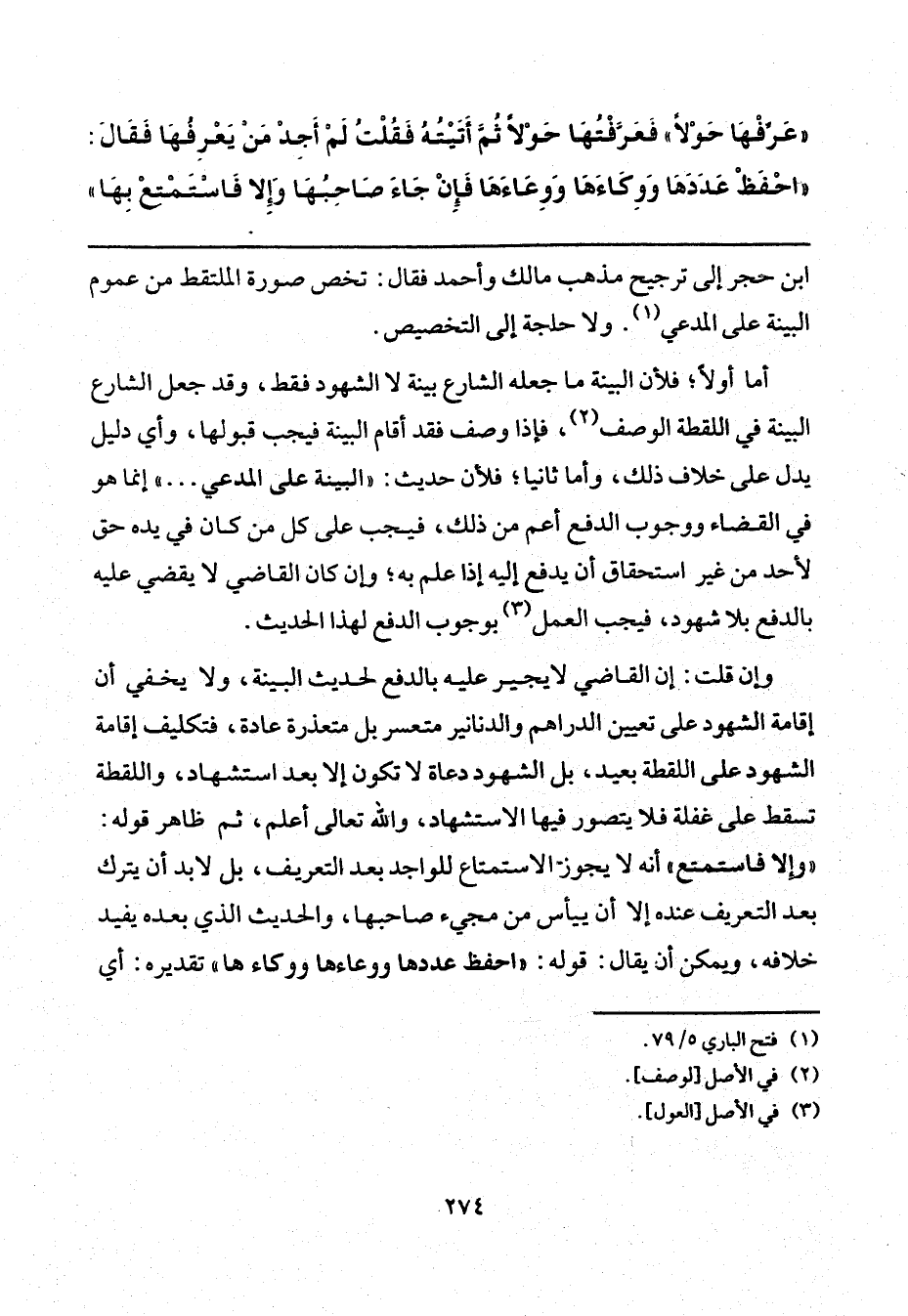 ابن حجر إلى ترجيح مذهب مالك وأحمد فقال: تخص صورة الملتقط من عموم البينة على المدعي (¬1). ولا حاجة إلى التخصيص.