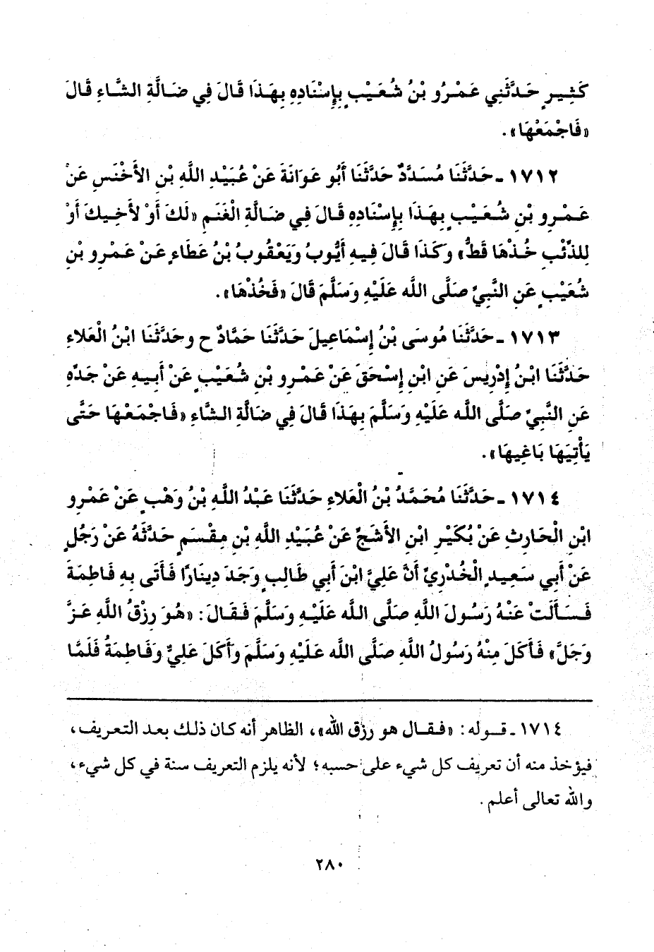 1713 - حَدَّثَنَا مُوسَى بْنُ إِسْمَاعِيلَ، حَدَّثَنَا حَمَّادٌ، ح وحَدَّثَنَا ابْنُ الْعَلَاءِ، حَدَّثَنَا ابْنُ إِدْرِيسَ، عَنْ ابْنِ إِسْحَاقَ، عَنْ عَمْرِو بْنِ شُعَيْبٍ، عَنْ أَبِيهِ، عَنْ جَدِّهِ، عَنِ النَّبِيِّ صَلَّى اللهُ عَلَيْهِ وَسَلَّمَ بِهَذَا، قَالَ فِي ضَالَّةِ الشَّاءِ: «فَاجْمَعْهَا حَتَّى يَأْتِيَهَا بَاغِيهَا».