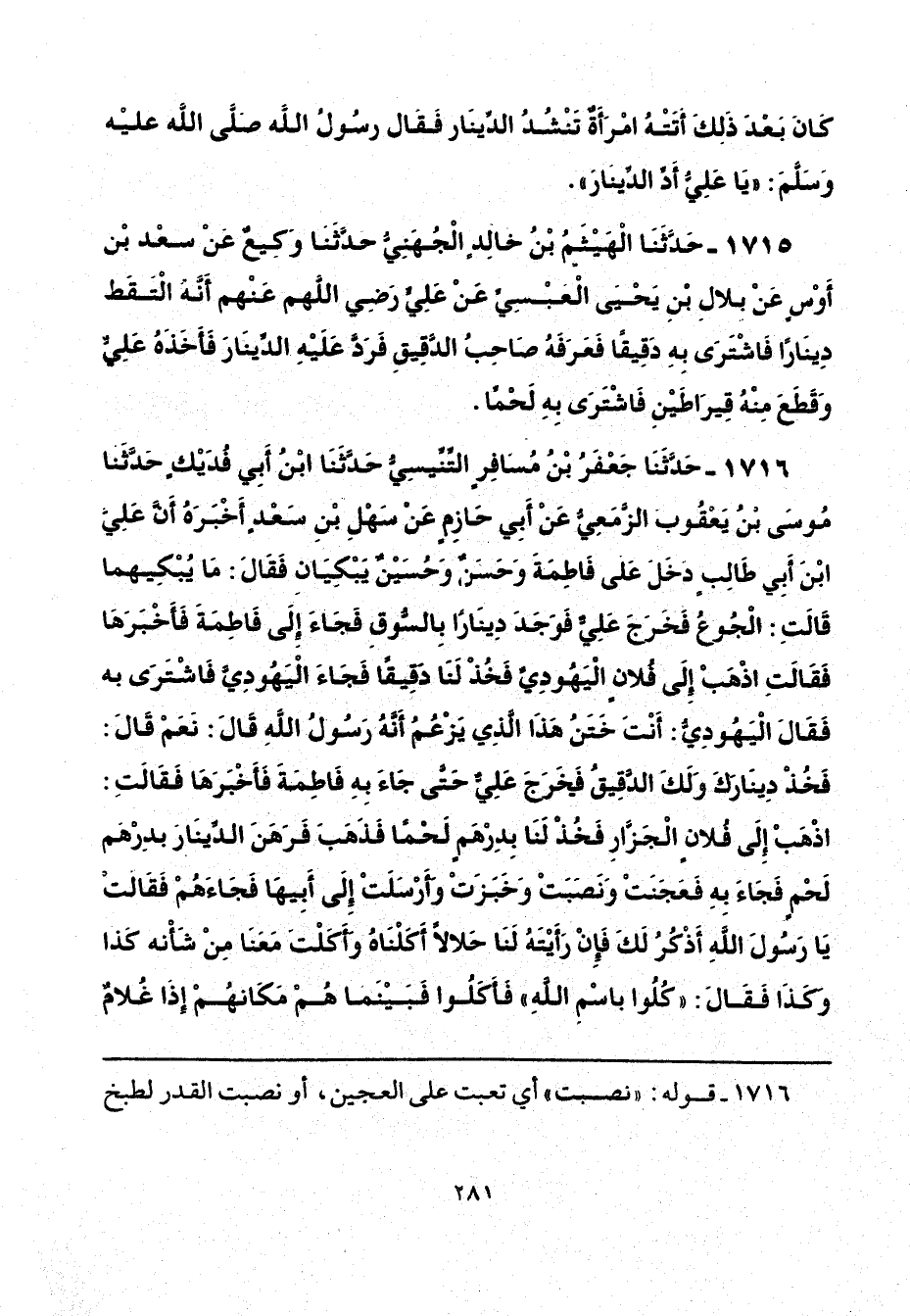 1716 - حَدَّثَنَا جَعْفَرُ بْنُ مُسَافِرٍ التِّنِّيسِيُّ، حَدَّثَنَا ابْنُ أَبِي فُدَيْكٍ، حَدَّثَنَا مُوسَى بْنُ يَعْقُوبَ الزَّمَعِيُّ، عَنْ أَبِي حَازِمٍ، عَنْ سَهْلِ بْنِ سَعْدٍ، أَخْبَرَهُ أَنَّ عَلِيَّ بْنَ أَبِي طَالِبٍ دَخَلَ عَلَى فَاطِمَةَ وَحَسَنٌ وَحُسَيْنٌ يَبْكِيَانِ فَقَالَ: مَا يُبْكِيهِمَا، قَالَتْ: الْجُوعُ فَخَرَج عَلِيٌّ فَوَجَدَ دِينَارًا بِالسُّوقِ فَجَاءَ إِلَى فَاطِمَةَ فَأَخْبَرَهَا فَقَالَتْ: اذْهَبْ إِلَى فُلَانٍ الْيَهُودِيِّ فَخُذْ لَنَا دَقِيقًا، فَجَاءَ الْيَهُودِيَّ فَاشْتَرَى بِهِ فَقَالَ الْيَهُودِيُّ: أَنْتَ خَتَنُ هَذَا الَّذِي يَزْعُمُ أَنَّهُ رَسُولُ اللَّهِ، قَالَ: نَعَمْ، قَالَ: فَخُذْ دِينَارَكَ وَلَكَ الدَّقِيقُ، فَخَرَجَ عَلِيٌّ حَتَّى جَاءَ بِهِ فَاطِمَةَ فَأَخْبَرَهَا، فَقَالَتْ: اذْهَبْ إِلَى فُلَانٍ الْجَزَّارِ فَخُذْ لَنَا بِدِرْهَمٍ لَحْمًا، فَذَهَبَ فَرَهَنَ الدِّينَارَ بِدِرْهَمِ لَحْمٍ فَجَاءَ بِهِ فَعَجَنَتْ وَنَصَبَتْ وَخَبَزَتْ، وَأَرْسَلَتْ إِلَى أَبِيهَا فَجَاءَهُمْ، فَقَالَتْ: يَا رَسُولَ اللَّهِ أَذْكُرُ لَكَ فَإِنْ رَأَيْتَهُ لَنَا حَلَالًا أَكَلْنَاهُ، وَأَكَلْتَ مَعَنَا مِنْ شَأْنِهِ كَذَا، وَكَذَا، فَقَالَ: «كُلُوا بِاسْمِ اللَّهِ»، فَأَكَلُوا فَبَيْنَمَا هُمْ مَكَانَهُمْ، إِذَا غُلَامٌ