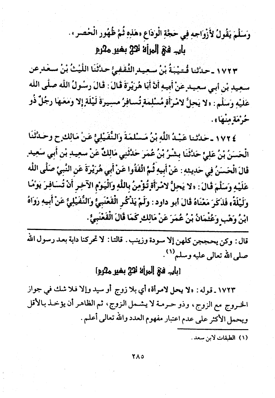 1723 - حَدَّثَنَا قُتَيْبَةُ بْنُ سَعِيدٍ الثَّقَفِيُّ، حَدَّثَنَا اللَّيْثُ بْنُ سَعْدٍ، عَنْ سَعِيدِ بْنِ أَبِي سَعِيدٍ، عَنْ أَبِيهِ، أَنَّ أَبَا هُرَيْرَةَ، قَالَ: قَالَ رَسُولُ اللَّهِ صَلَّى اللهُ عَلَيْهِ وَسَلَّمَ: «لَا يَحِلُّ لِامْرَأَةٍ مُسْلِمَةٍ تُسَافِرُ مَسِيرَةَ لَيْلَةٍ، إِلَّا وَمَعَهَا رَجُلٌ ذُو حُرْمَةٍ مِنْهَا».
