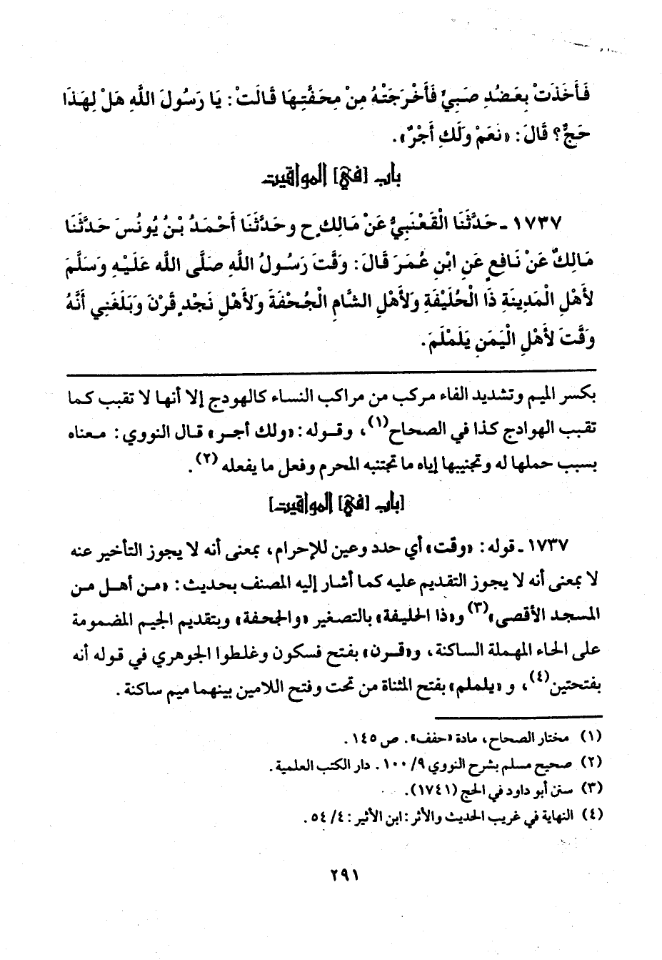 1737 - قوله: "وقت" أي حدد وعين للإحرام، بمعنى أنه لا يجوز التأخير عنه لا بمعنى أنه لا يجوز التقديم عليه كما أشار إليه المصنف بحديث: "من أهل من المسجد الأقصى" (¬3) و"ذا الحليفة" بالتصغير "والجحفة" وبتقديم الجيم المضمومة على الحاء المهملة الساكنة، و "قرن" بفتح فسكون وغلطوا الجوهري في قوله أنه بفتحتين (¬4)، و "يلملم" بفتح المثناة من تحت وفتح اللامين بينهما ميم ساكنة.