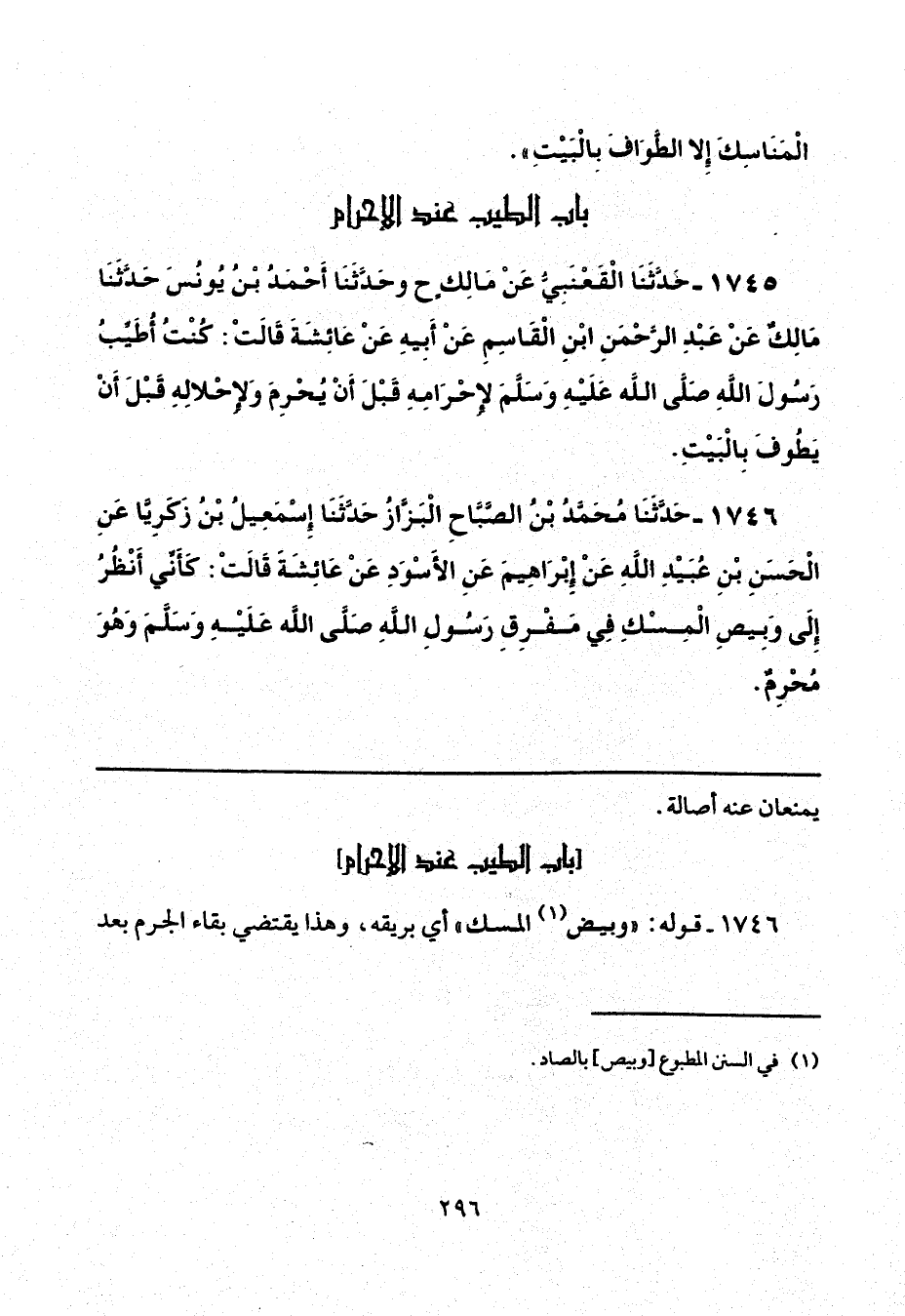 1745 - حَدَّثَنَا الْقَعْنَبِيُّ، عَنْ مَالِكٍ، ح وحَدَّثَنَا أَحْمَدُ بْنُ يُونُسَ، حَدَّثَنَا مَالِكٌ، عَنْ عَبْدِ الرَّحْمَنِ بْنِ الْقَاسِمِ، عَنْ أَبِيهِ، عَنْ عَائِشَةَ، قَالَتْ: «كُنْتُ أُطَيِّبُ رَسُولَ اللَّهِ صَلَّى اللهُ عَلَيْهِ وَسَلَّمَ لِإِحْرَامِهِ، قَبْلَ أَنْ يُحْرِمَ، وَلِإِحْلَالِهِ قَبْلَ أَنْ يَطُوفَ بِالْبَيْتِ».