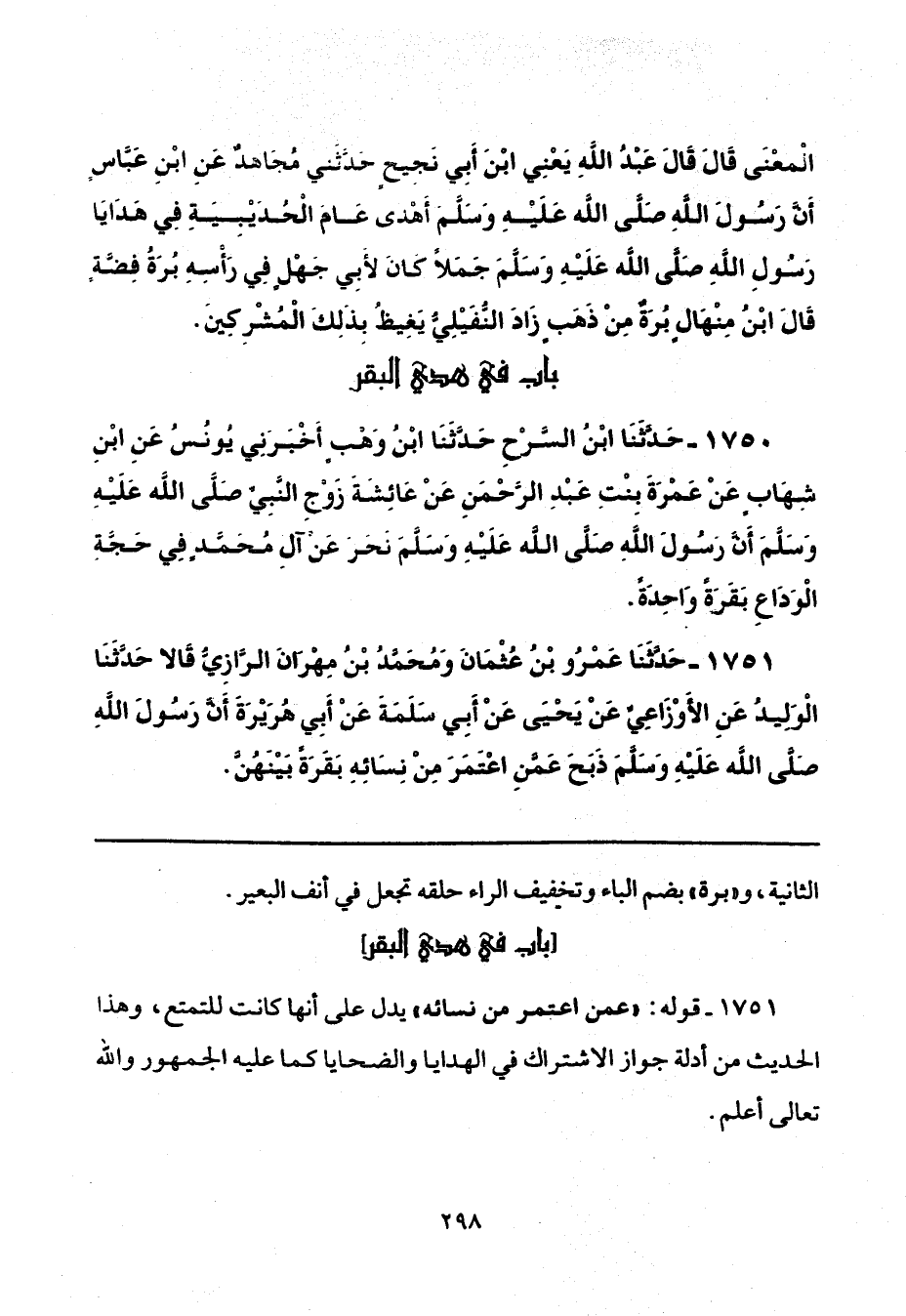 1750 - حَدَّثَنَا ابْنُ السَّرْحِ، حَدَّثَنَا ابْنُ وَهْبٍ، أَخْبَرَنِي يُونُسُ، عَنِ ابْنِ شِهَابٍ، عَنْ عَمْرَةَ بِنْتِ عَبْدِ الرَّحْمَنِ، عَنْ عَائِشَةَ زَوْجِ النَّبِيِّ صَلَّى اللهُ عَلَيْهِ وَسَلَّمَ، أَنَّ رَسُولَ اللَّهِ صَلَّى اللهُ عَلَيْهِ وَسَلَّمَ «نَحَرَ عَنْ آلِ مُحَمَّدٍ فِي حَجَّةِ الْوَدَاعِ بَقَرَةً وَاحِدَةً».