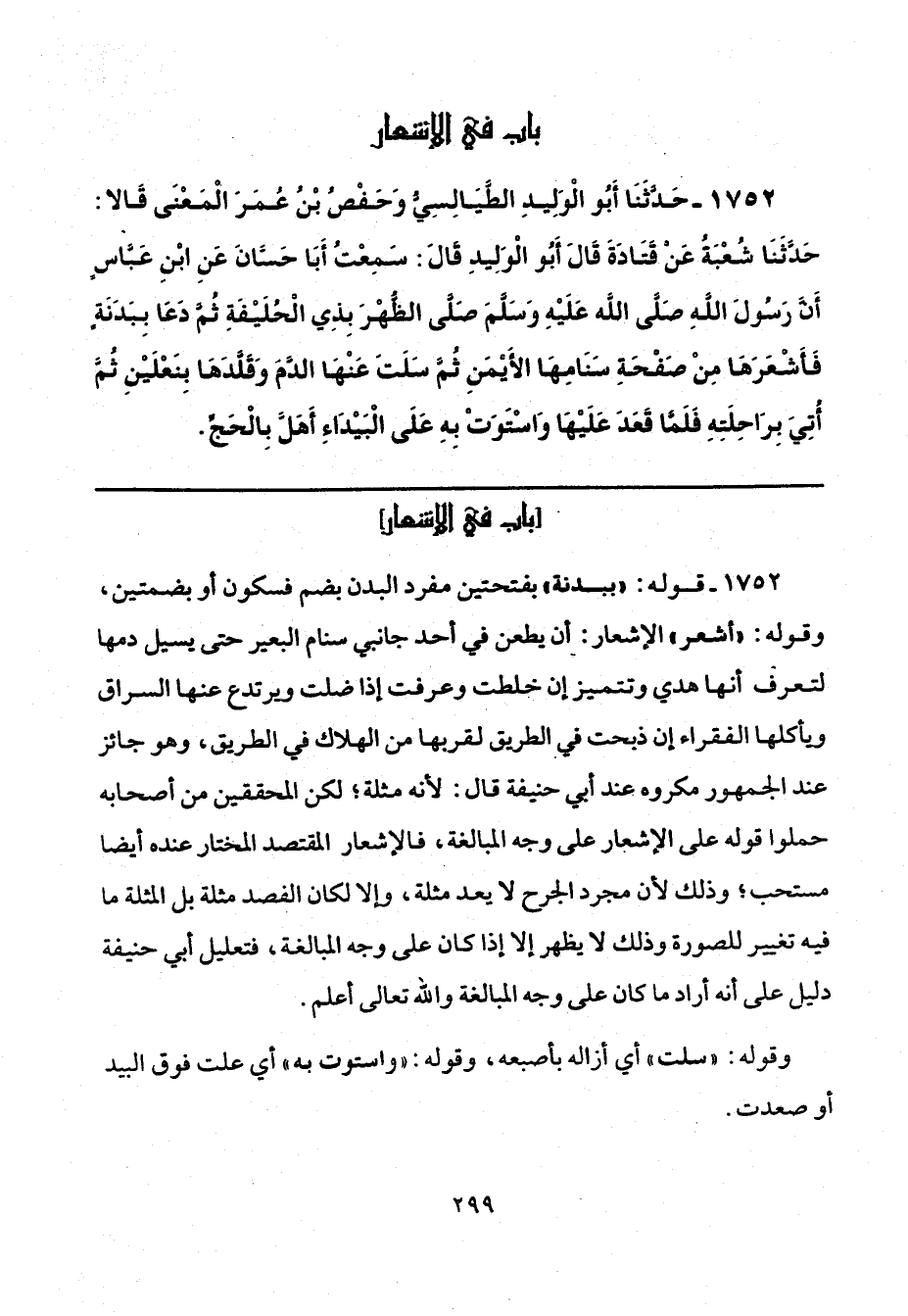 1752 - قوله: "ببدنة" بفتحتين مفرد البدن بضم فسكون أو بضمتين، وقوله: "أشعر" الإشعار: أن يطعن في أحد جانبي سنام البعير حتَّى يسيل دمها لتعرف أنها هدي وتتميز إن خلطت وعرفت إذا ضلت ويرتدع عنها السراق ويأكلها الفقراء إن ذبحت في الطريق لقربها من الهلاك في الطريق، وهو جائز عند الجمهور مكروه عند أبي حنيفة قال: لأنَّه مثلة؛ لكن المحققين من أصحابه حملوا قوله على الإشعار على وجه المبالغة، فالإشعار المقتصد المختار عنده أيضًا مستحب؛ وذلك لأنَّ مجرد الجرح لا يعد مثلة، وإلا لكان الفصد مثلة بل المثلة ما فيه تغيير للصورة وذلك لا يظهر إلَّا إذا كان على وجه المبالغة، فتعليل أبي حنيفة دليل على أنه أراد ما كان على وجه المبالغة والله تعالى أعلم.