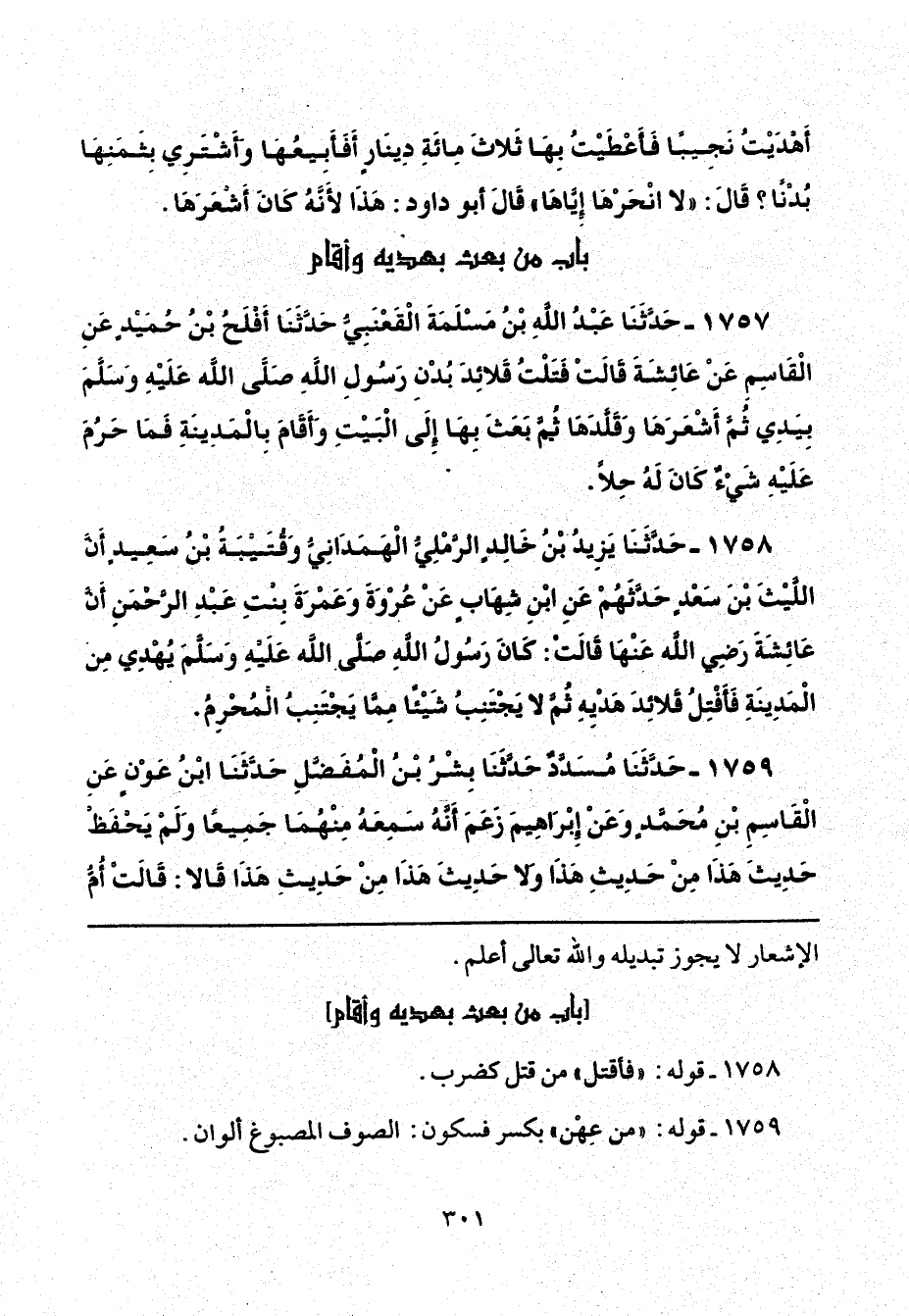 1757 - حَدَّثَنَا عَبْدُ اللَّهِ بْنُ مَسْلَمَةَ الْقَعْنَبِيُّ، حَدَّثَنَا أَفْلَحُ بْنُ حُمَيْدٍ، عَنِ الْقَاسِمِ، عَنْ عَائِشَةَ، قَالَتْ: «فَتَلْتُ قَلَائِدَ بُدْنِ رَسُولِ اللَّهِ صَلَّى اللهُ عَلَيْهِ وَسَلَّمَ بِيَدِي، ثُمَّ أَشْعَرَهَا، وَقَلَّدَهَا، ثُمَّ بَعَثَ بِهَا إِلَى الْبَيْتِ وَأَقَامَ بِالْمَدِينَةِ فَمَا حَرُمَ عَلَيْهِ شَيْءٌ كَانَ لَهُ حِلًّا».