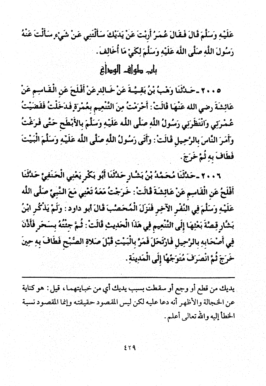 2006 - حَدَّثَنَا مُحَمَّدُ بْنُ بَشَّارٍ، حَدَّثَنَا أَبُو بَكْرٍ يَعْنِي الْحَنَفِيَّ، حَدَّثَنَا أَفْلَحُ، عَنِ الْقَاسِمِ، عَنْ عَائِشَةَ، قَالَتْ: «خَرَجْتُ مَعَهُ تَعْنِي مَعَ النَّبِيِّ صَلَّى اللهُ عَلَيْهِ وَسَلَّمَ فِي النَّفْرِ الْآخِرِ فَنَزَلَ الْمُحَصَّبَ»، قَالَ أَبُو دَاوُدَ: وَلَمْ يَذْكُرْ ابْنُ بَشَّارٍ قِصَّةَ بَعْثِهَا إِلَى التَّنْعِيمِ فِي هَذَا الْحَدِيثِ، قَالَتْ: " ثُمَّ جِئْتُهُ بِسَحَرٍ فَأَذَّنَ فِي أَصْحَابِهِ بِالرَّحِيلِ فَارْتَحَلَ فَمَرَّ بِالْبَيْتِ قَبْلَ صَلَاةِ الصُّبْحِ فَطَافَ بِهِ حِينَ خَرَجَ، ثُمَّ انْصَرَفَ مُتَوَجِّهًا إِلَى الْمَدِينَةِ.