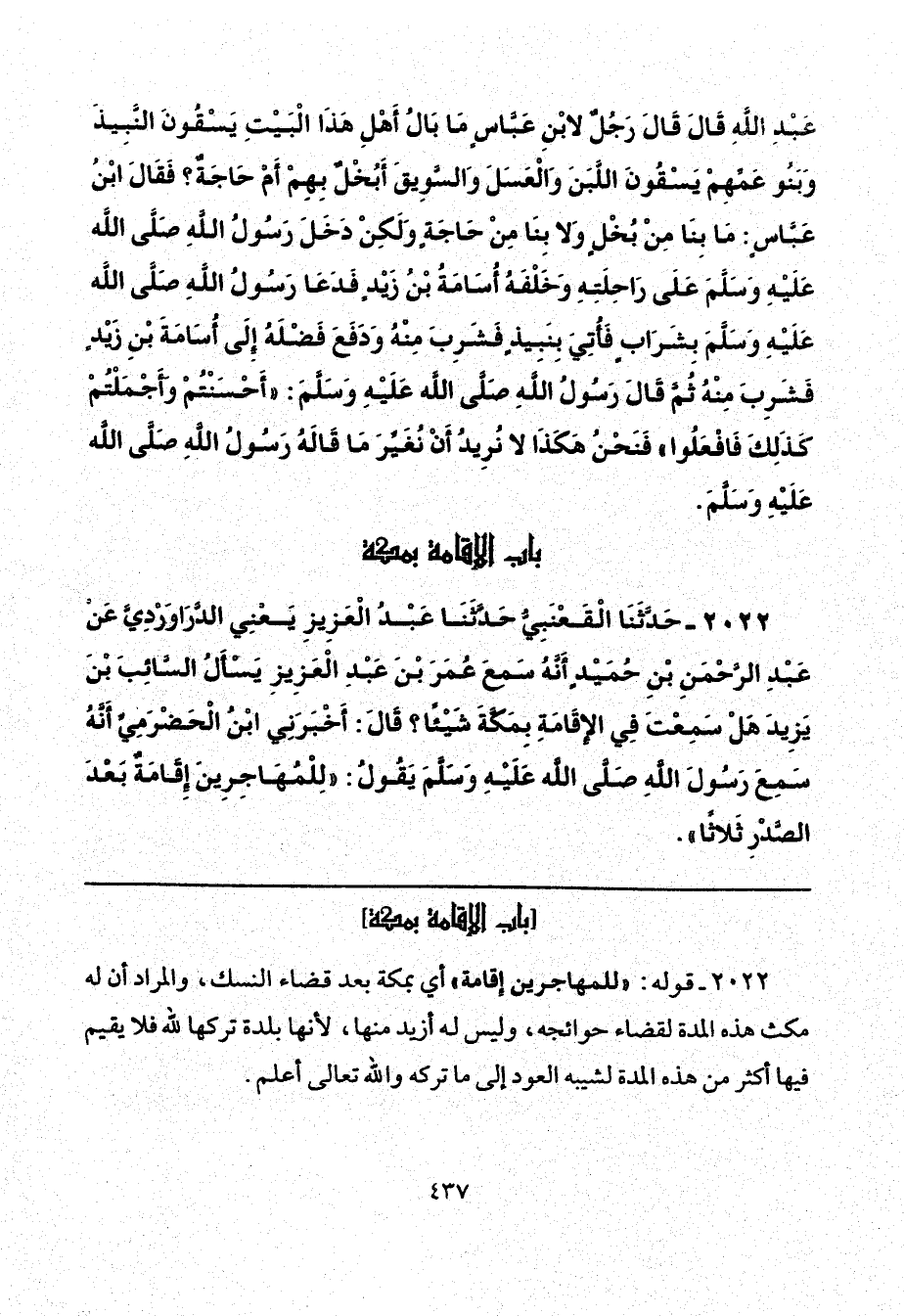 2022 - حَدَّثَنَا الْقَعْنَبِيُّ، حَدَّثَنَا عَبْدُ الْعَزِيزِ يَعْنِي الدَّرَاوَرْدِيَّ، عَنْ عَبْدِ الرَّحْمَنِ بْنِ حُمَيْدٍ، أَنَّهُ سَمِعَ عُمَرَ بْنَ عَبْدِ الْعَزِيزِ، يَسْأَلُ السَّائِبَ بْنَ يَزِيدَ، هَلْ سَمِعْتَ فِي الْإِقَامَةِ بِمَكَّةَ شَيْئًا قَالَ: أَخْبَرَنِي ابْنُ الْحَضْرَمِيِّ، أَنَّهُ سَمِعَ رَسُولَ اللَّهِ صَلَّى اللهُ عَلَيْهِ وَسَلَّمَ يَقُولُ لِلْمُهَاجِرِينَ: «إِقَامَةٌ بَعْدَ الصَّدْرِ ثَلَاثًا».