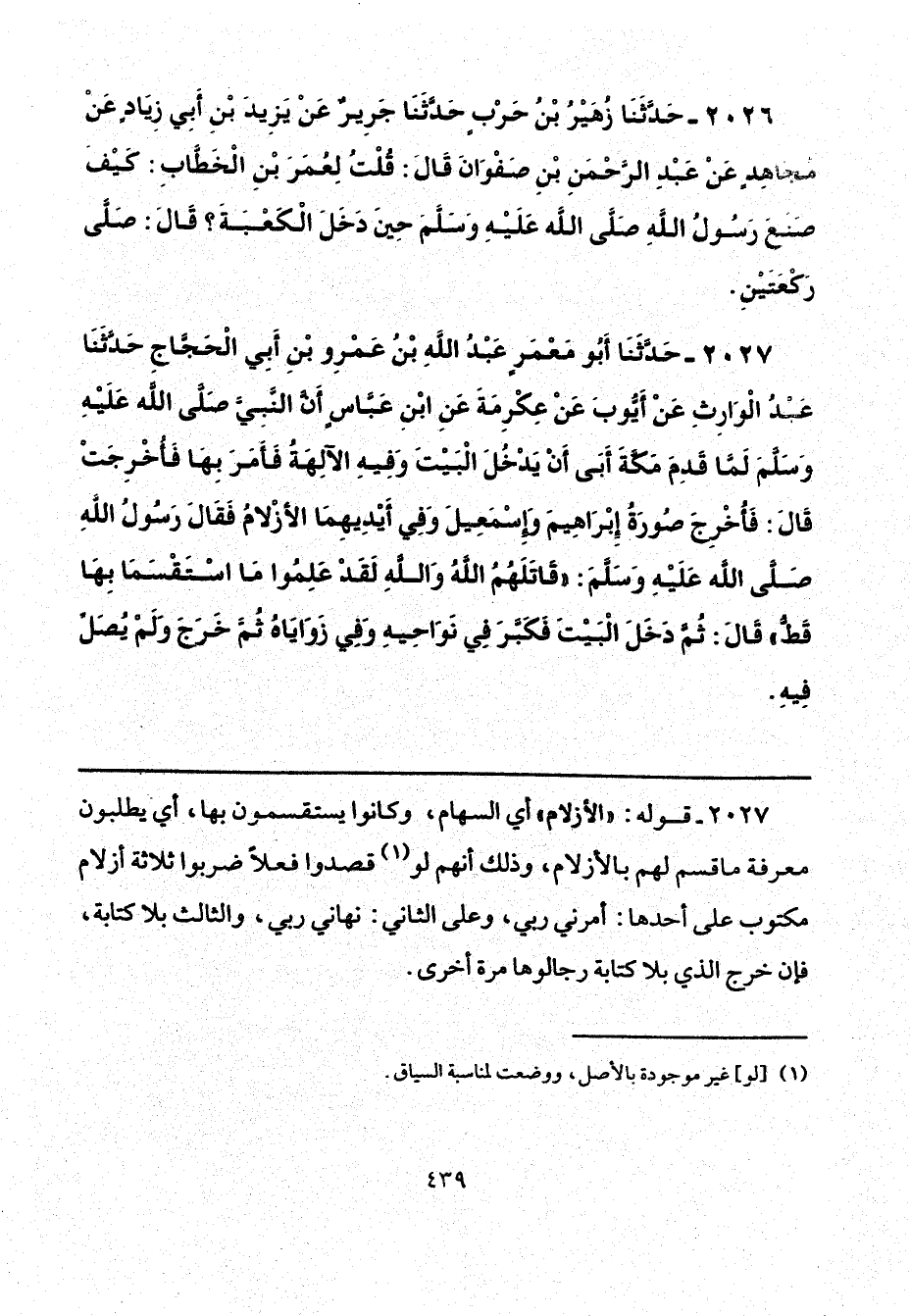 2026 - حَدَّثَنَا زُهَيْرُ بْنُ حَرْبٍ، حَدَّثَنَا جَرِيرٌ، عَنْ يَزِيدَ بْنِ أَبِي زِيَادٍ، عَنْ مُجَاهِدٍ، عَنْ عَبْدِ الرَّحْمَنِ بْنِ صَفْوَانَ، قَالَ: قُلْتُ لِعُمَرَ بْنِ الْخَطَّابِ: كَيْفَ صَنَعَ رَسُولُ اللَّهِ صَلَّى اللهُ عَلَيْهِ وَسَلَّمَ حِينَ دَخَلَ الْكَعْبَةَ؟ قَالَ: «صَلَّى رَكْعَتَيْنِ».