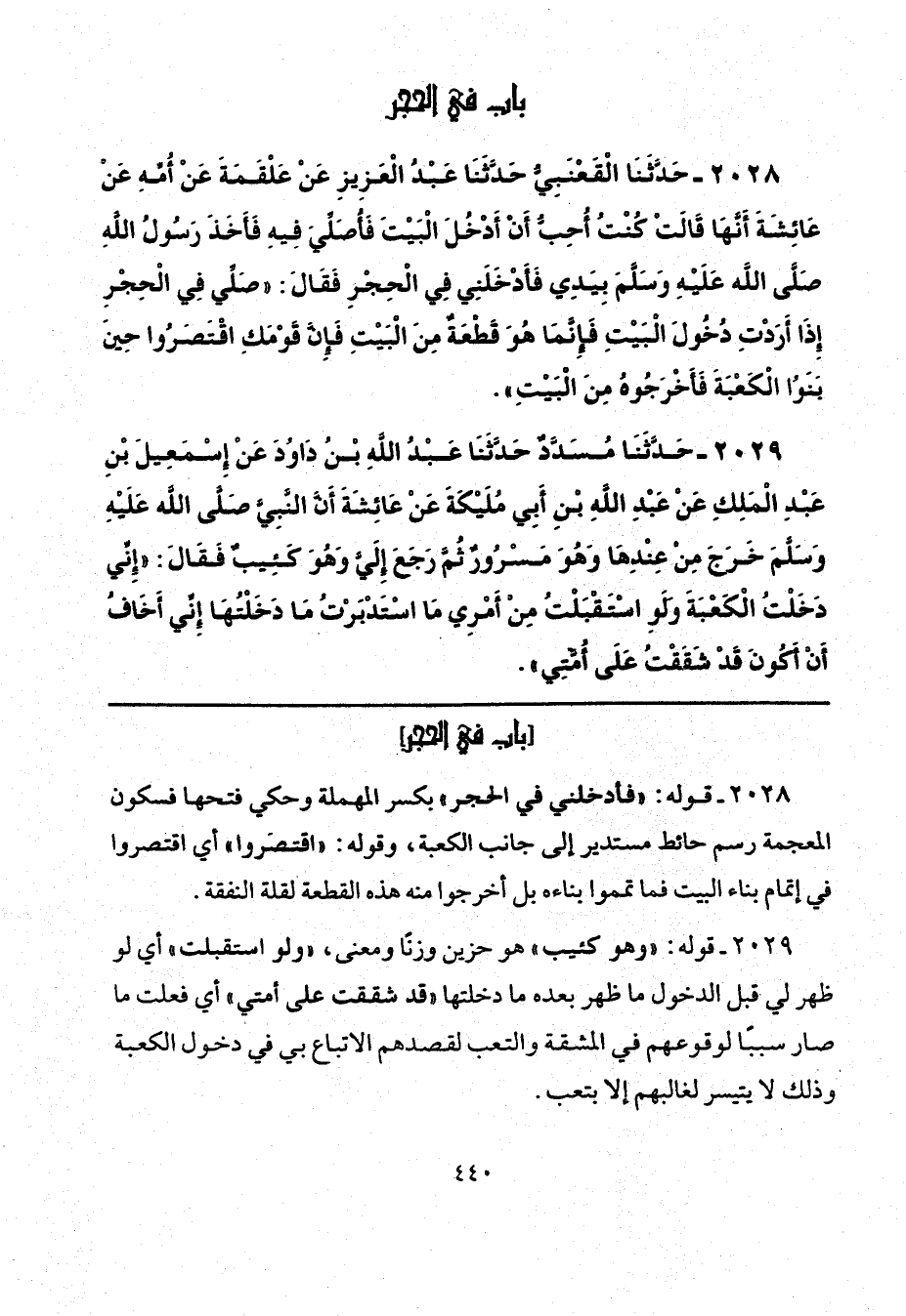 2028 - قوله: "فأدخلني في الحجر" بكسر المهملة وحكي فتحها فسكون المعجمة رسم حائط مستدير إلى جانب الكعبة، وقوله: "اقتصروا" أي اقتصروا في إتمام بناء البيت فما تمموا بناءه بل أخرجوا منه هذه القطعة لقلة النفقة.