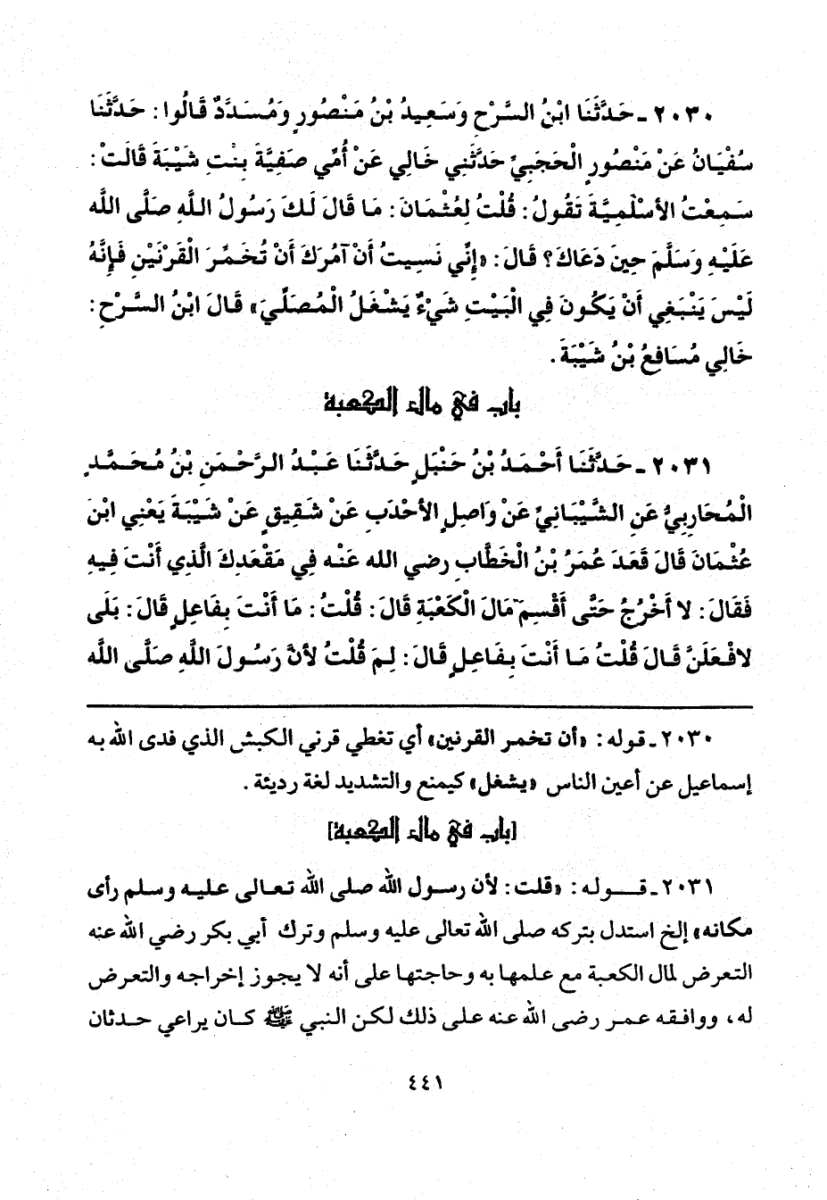 2030 - قوله: "أن تخمر القرنين" أي تغطي قرني الكبش الذي فدى الله به إسماعيل عن أعين الناس "يشغل" كيمنع والتشديد لغة رديئة.