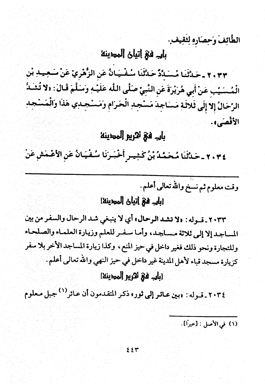 2033 - قوله: "لا تشد الرحال" أي لا ينبغي شد الرحال والسفر من بين المساجد إلا إلى ثلاثة مساجد، وأما سفر للعلم وزيارة العلماء والصلحاء وللتجارة ونحو ذلك فغير داخل في حيز المنع، وكذا زيارة المساجد الأخر بلا سفر كزيارة مسجد قباء لأهل المدينة غير داخل في حيز النهي والله تعالى أعلم.